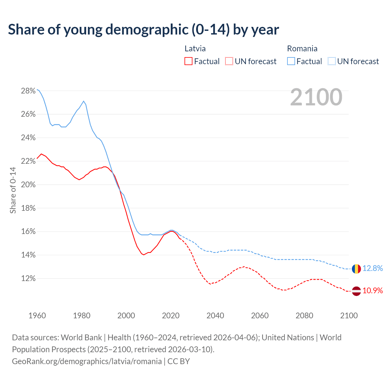 - The share of young demographic (0-15 years old) in Latvia is 15.4% vs 15.7% in Romania.