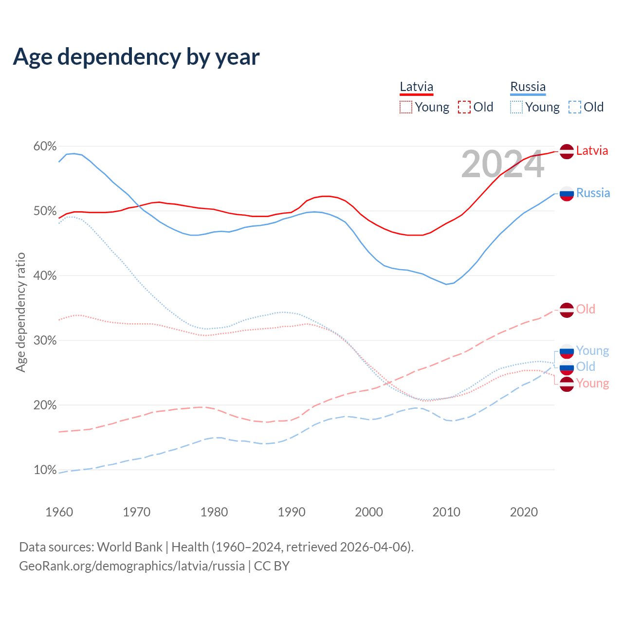 - Latvia is ranked 20/196 by median age (oldest to youngest) vs 42/196 for Russia.