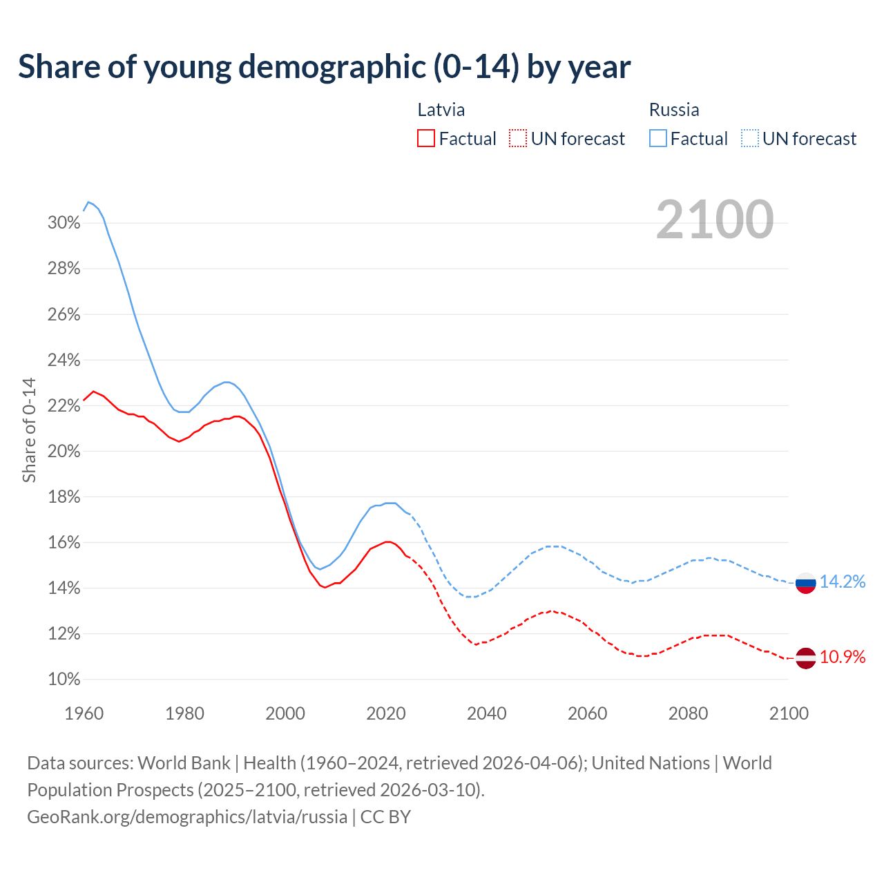 Median age Latvia vs Russia, 1960-2100
