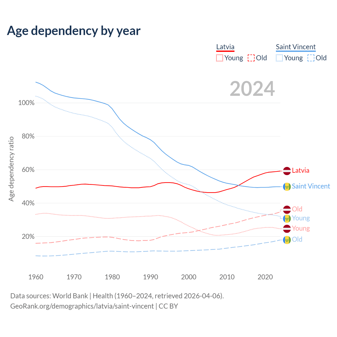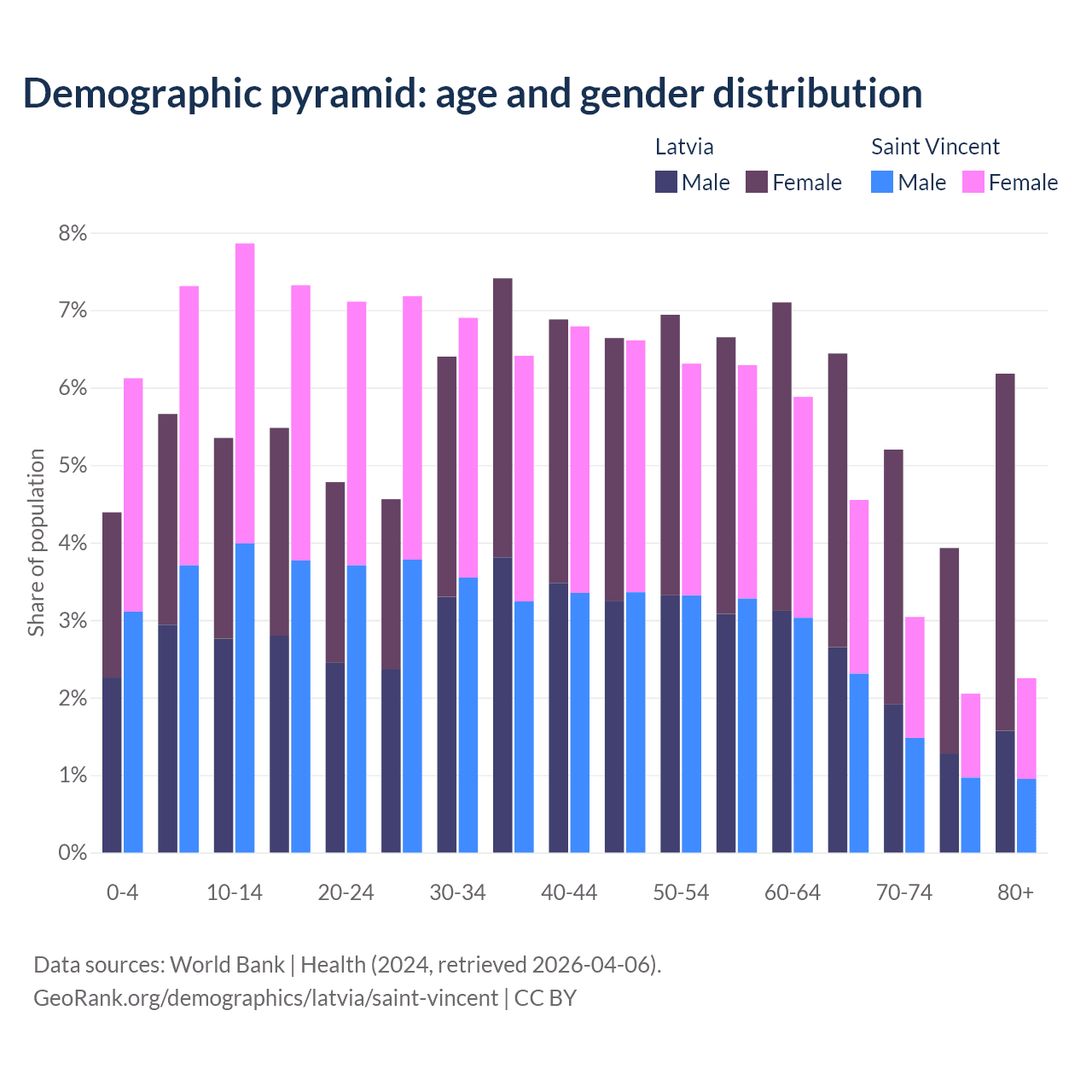 - The share of old-age demographic (65+) in Latvia is 21.7% vs 11.9% in Saint Vincent.