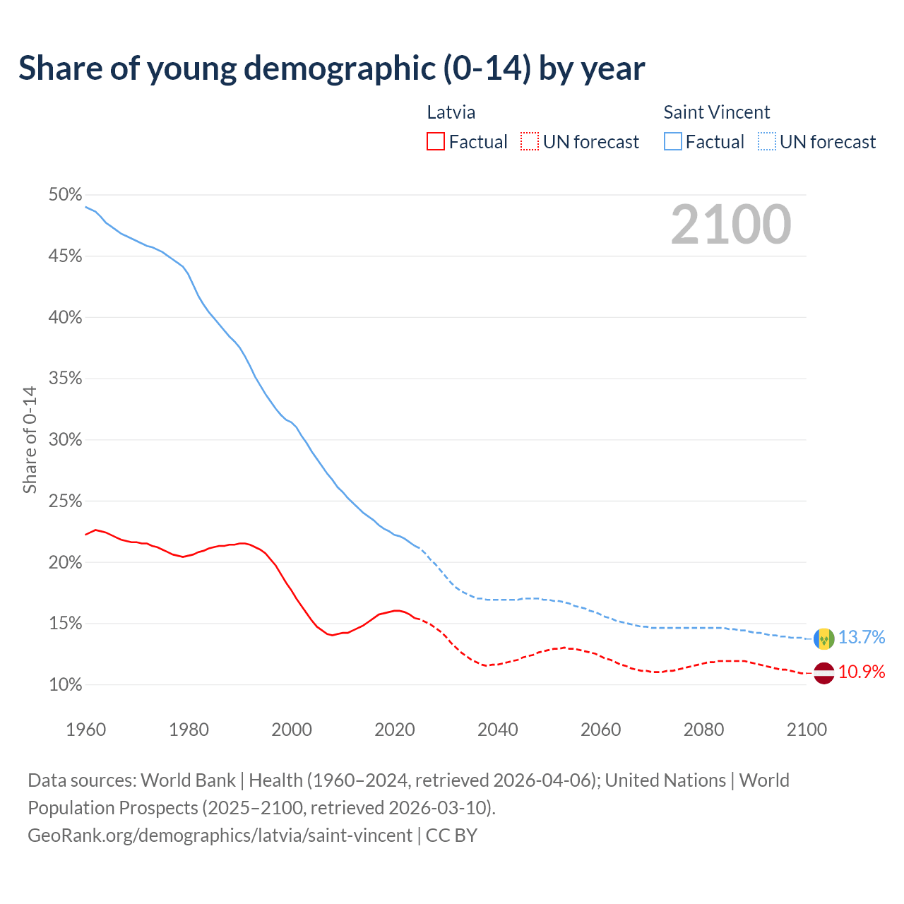 - The share of young demographic (0-15 years old) in Latvia is 15.4% vs 21.3% in Saint Vincent.