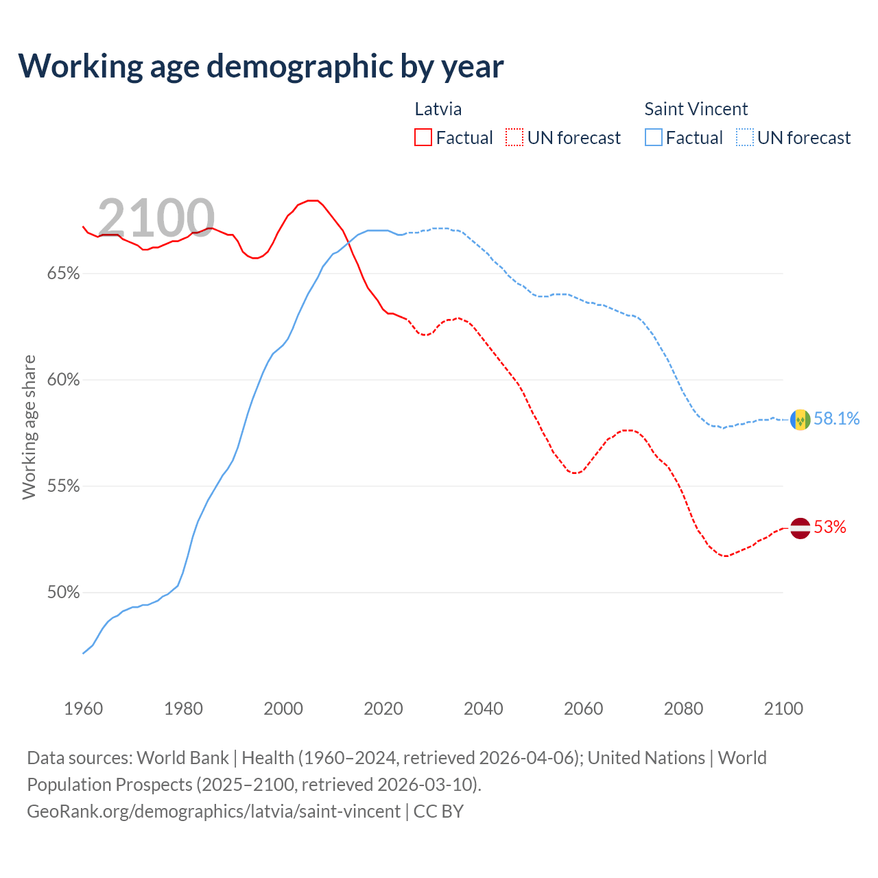 - Latvia has 1.15M working age adults (aged 15-64) vs 66.3K in Saint Vincent.