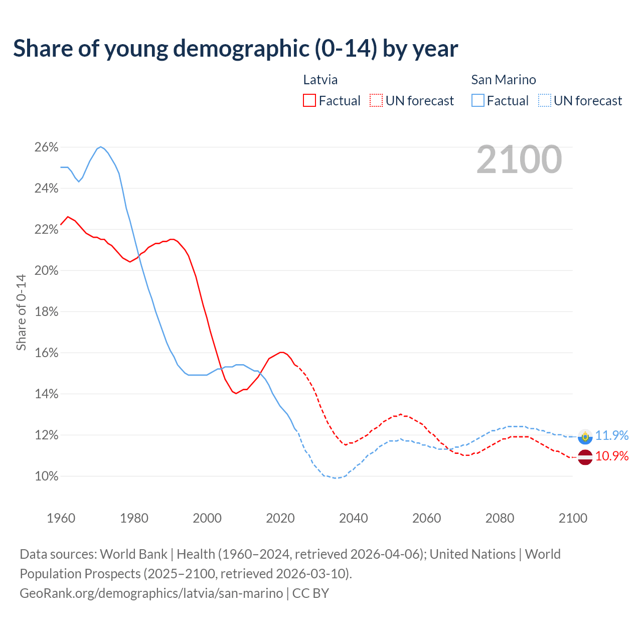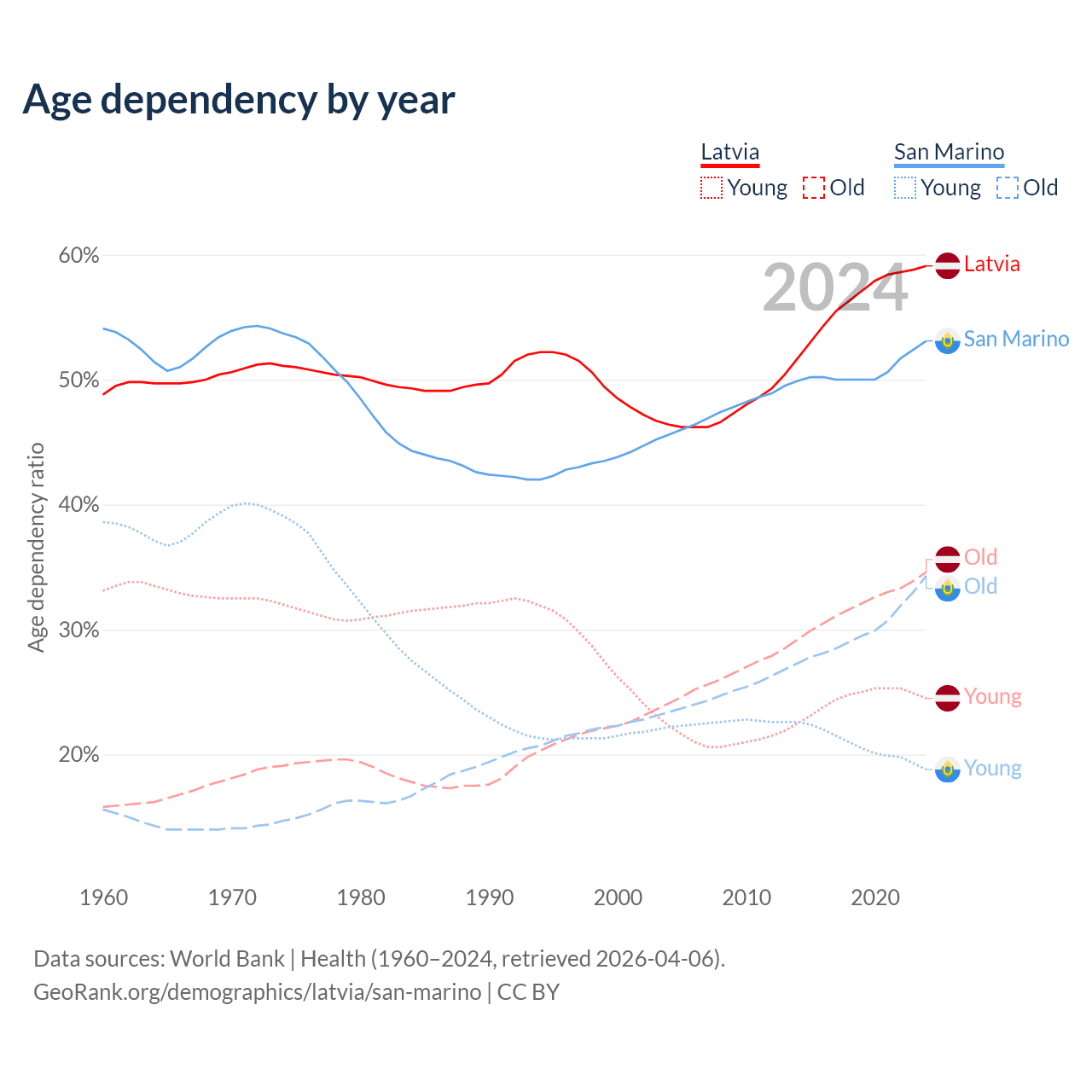 - The share of young demographic (0-15 years old) in Latvia is 15.4% vs 12.3% in San Marino.