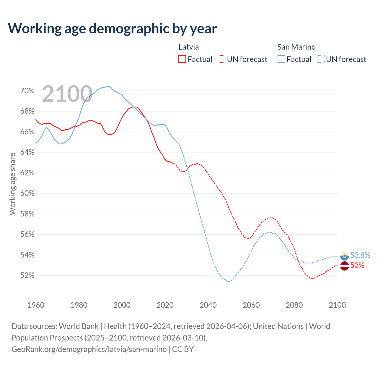 Median age Latvia vs San Marino, 1960-2100