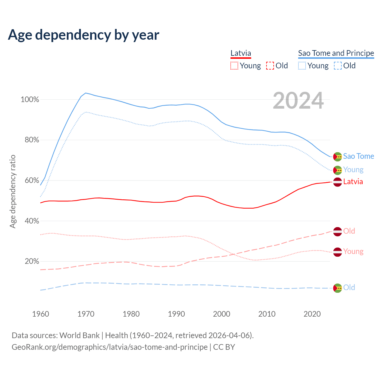- Latvia is ranked 20/196 by median age (oldest to youngest) vs 163/196 for Sao Tome and Principe.