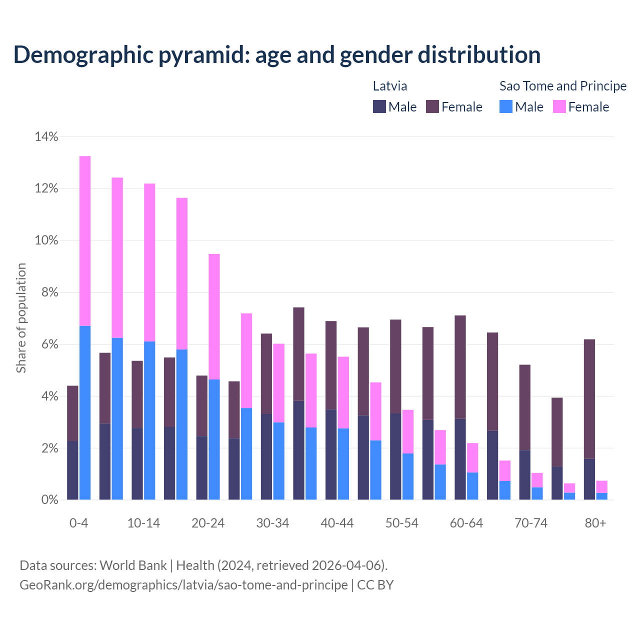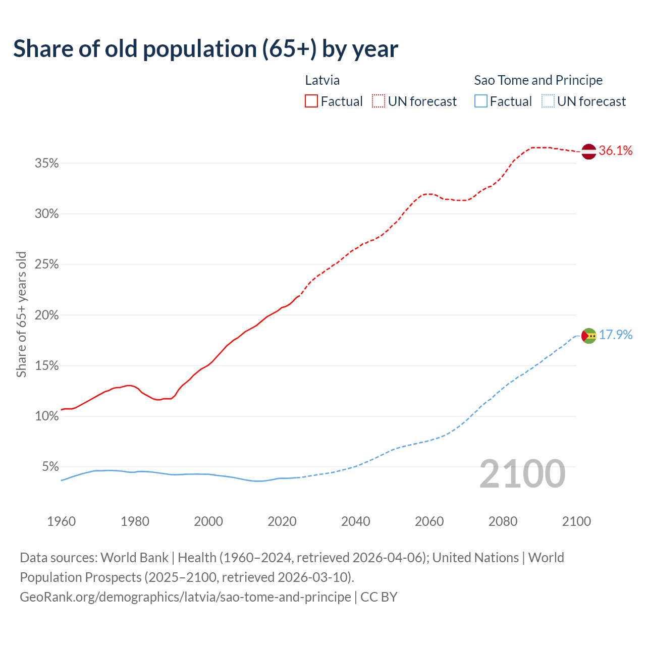 The share of older people aged 65 and over is 21.7% in Latvia and 3.9% in Sao Tome and Principe. Life expectancy in Latvia compared to Sao Tome and Principe .