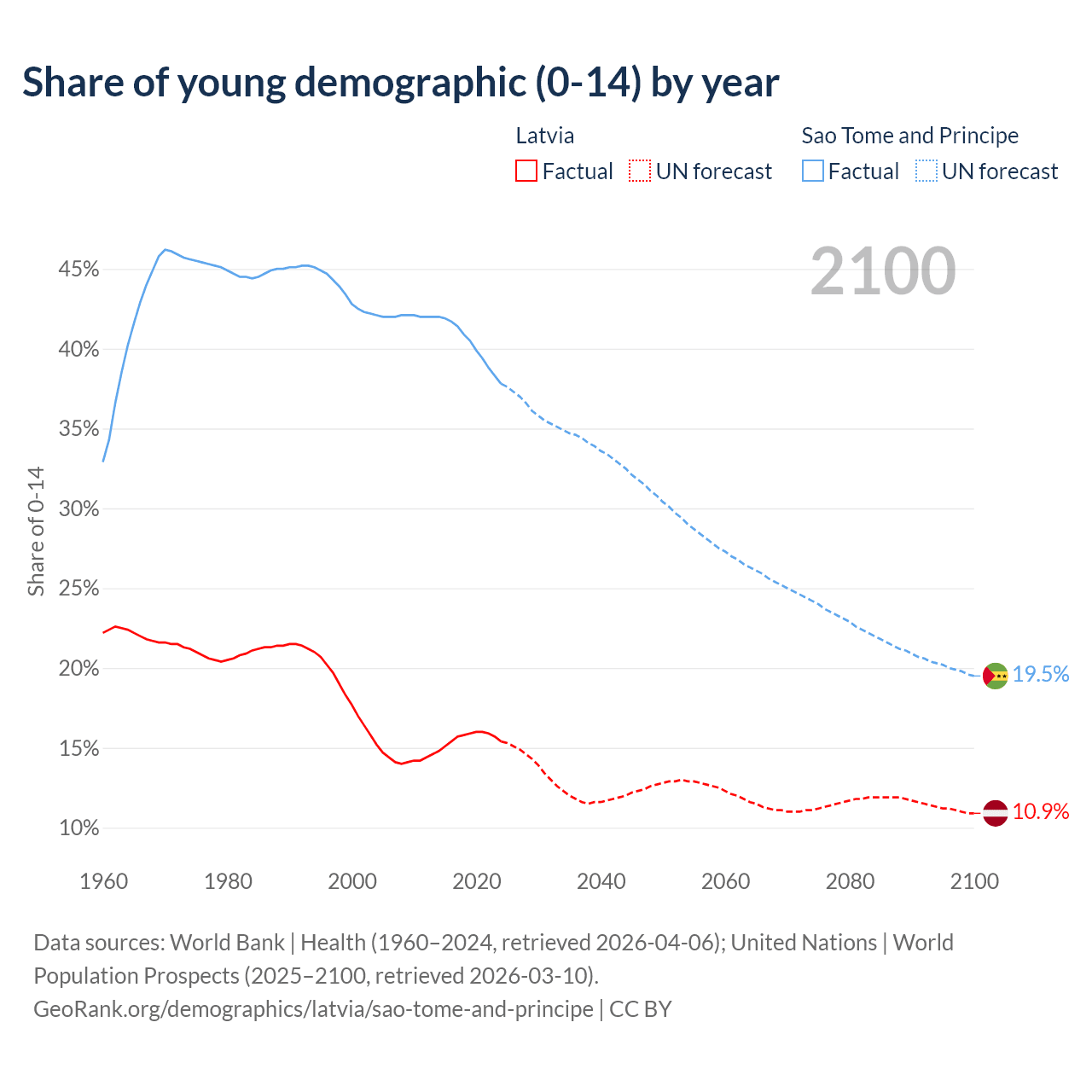 - The share of young demographic (0-15 years old) in Latvia is 15.4% vs 37.8% in Sao Tome and Principe.