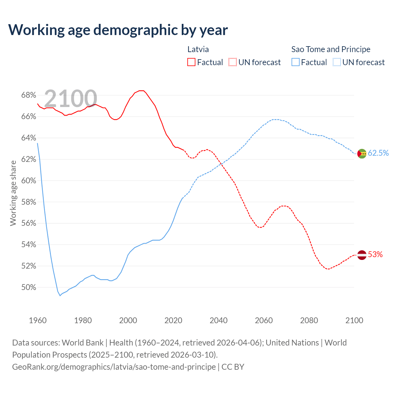 Median age Latvia vs Sao Tome and Principe, 1960-2100