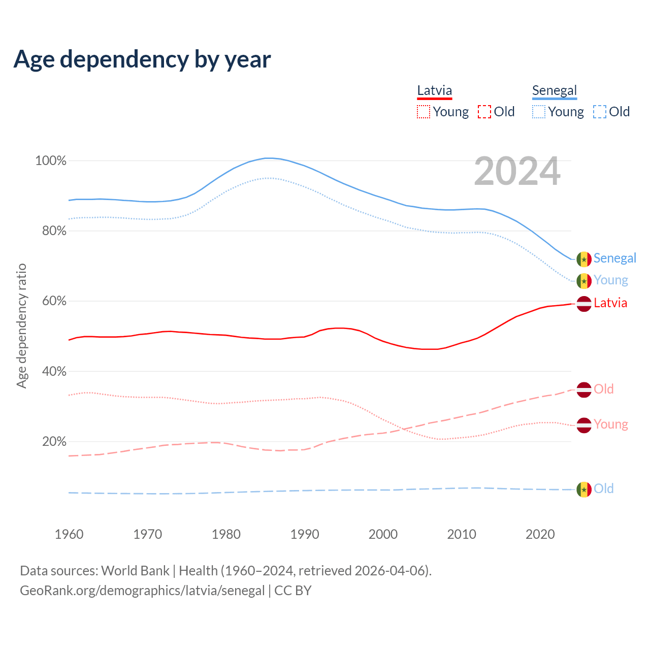 - Latvia is ranked 20/196 by median age (oldest to youngest) vs 162/196 for Senegal.