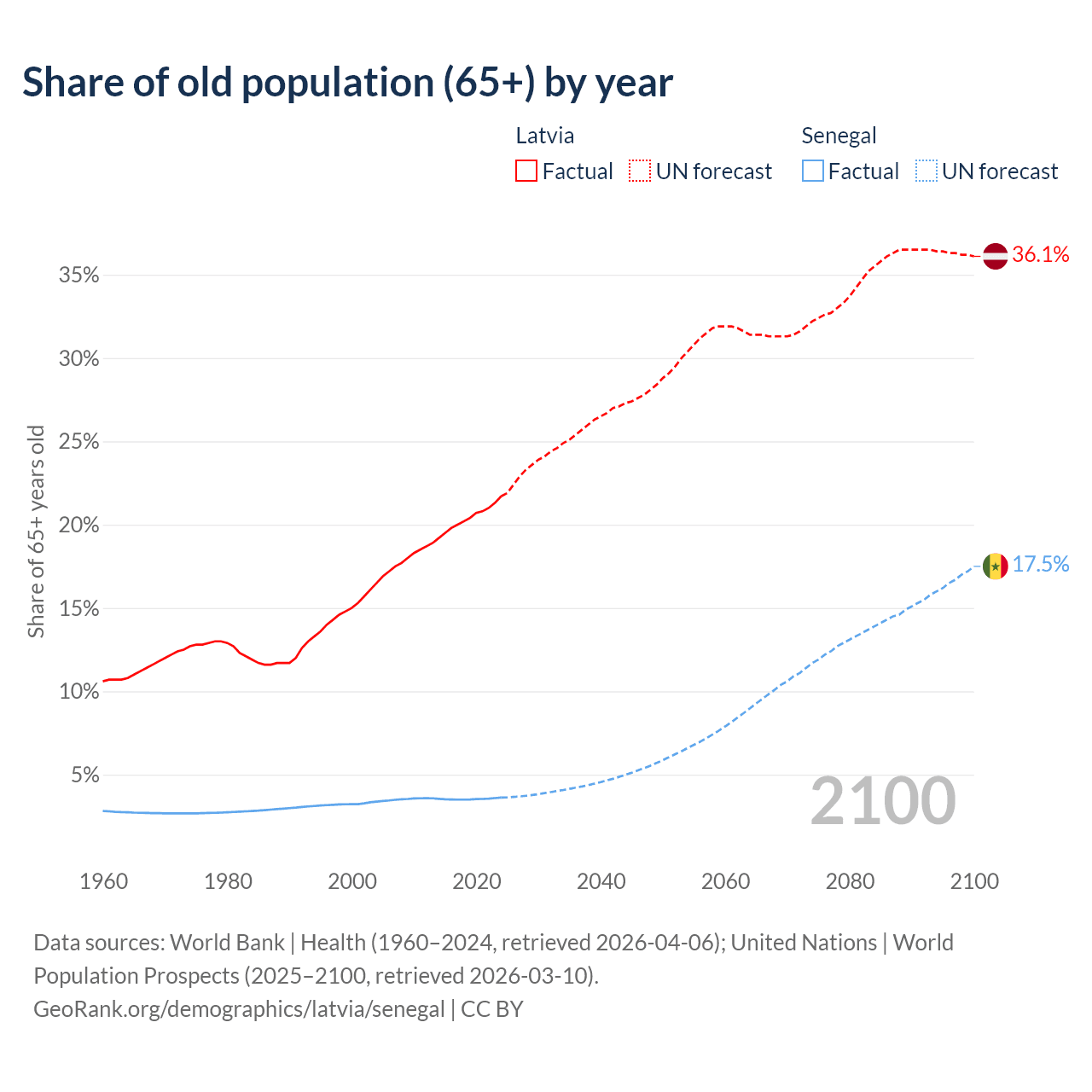 - The share of old-age demographic (65+) in Latvia is 21.7% vs 3.62% in Senegal.