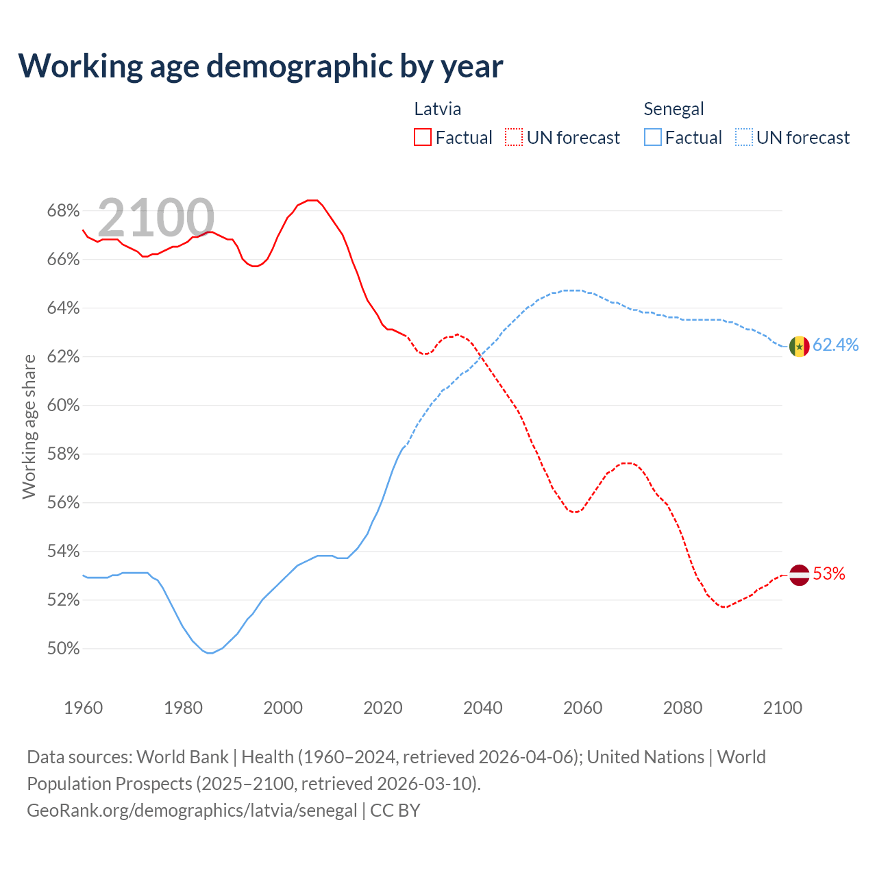 Median age Latvia vs Senegal, 1960-2100