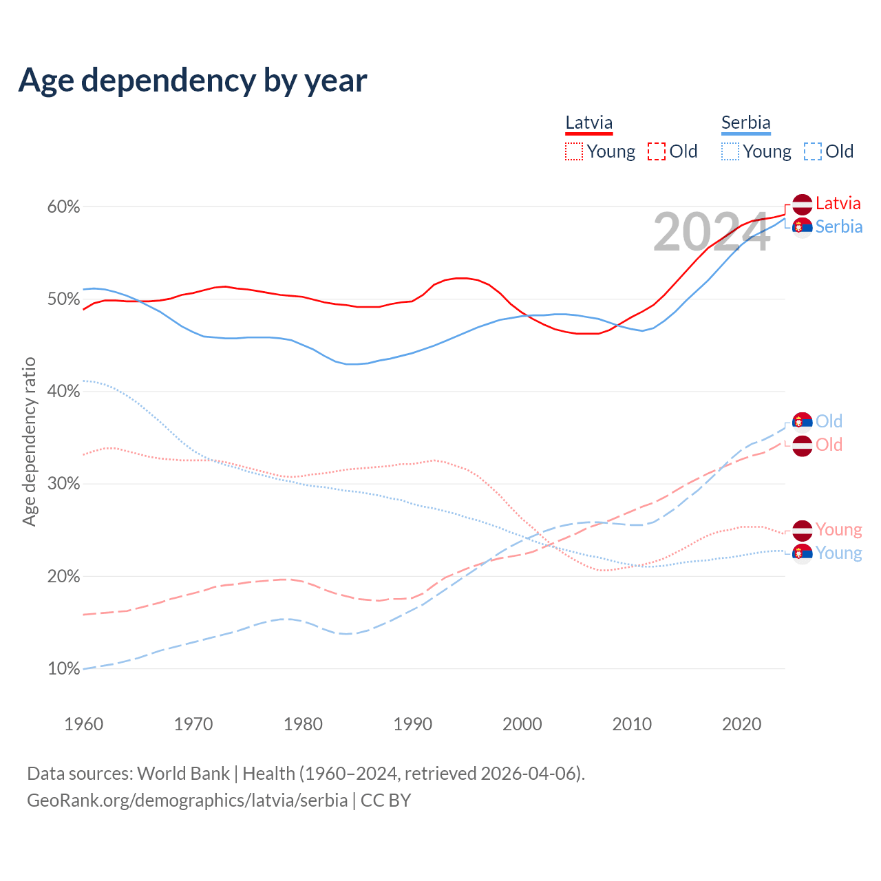 - Latvia is ranked 20/196 by median age (oldest to youngest) vs 15/196 for Serbia.