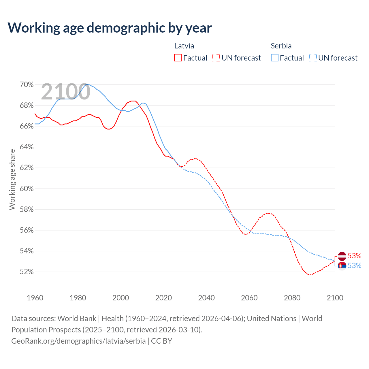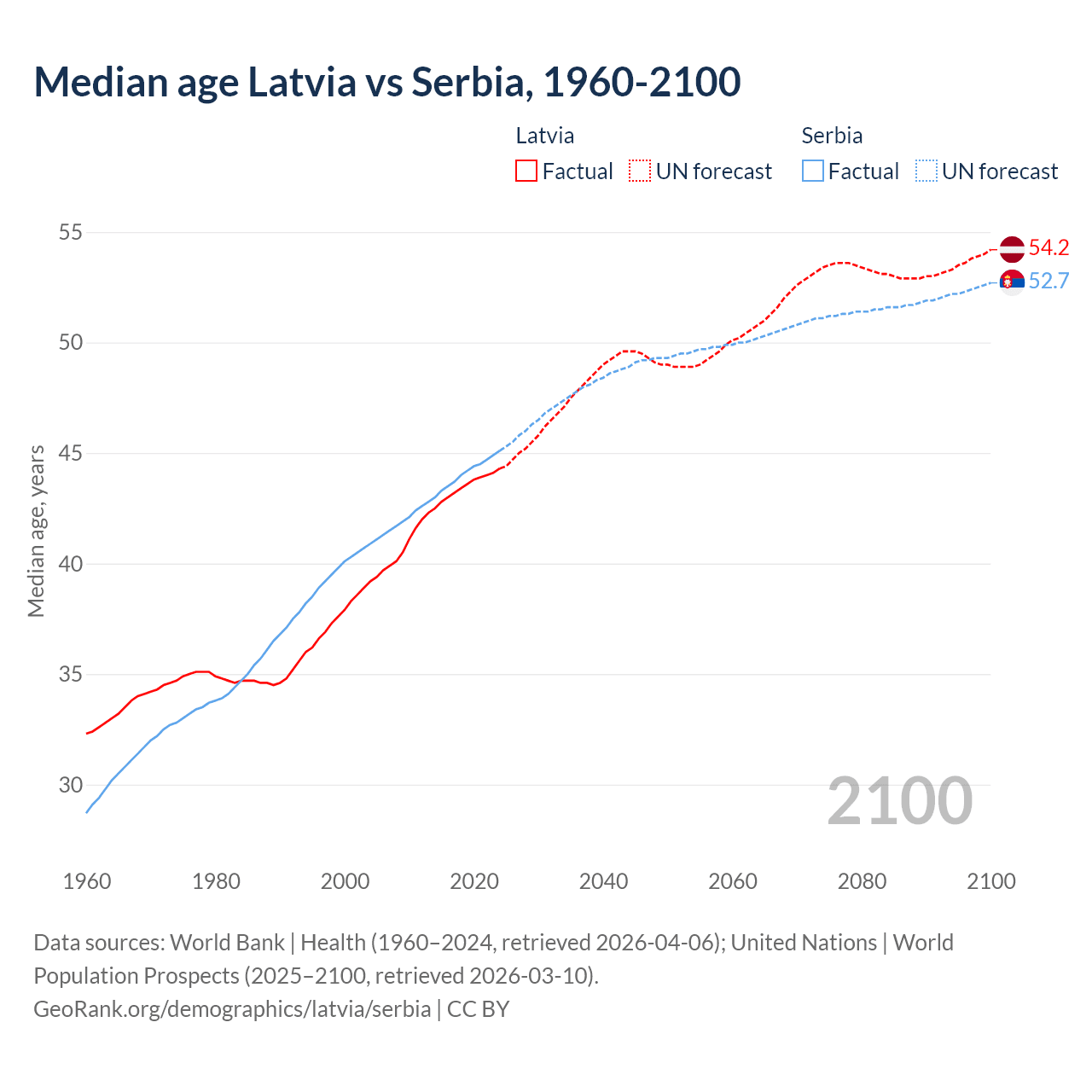 Median age Latvia vs Serbia, 1960-2100