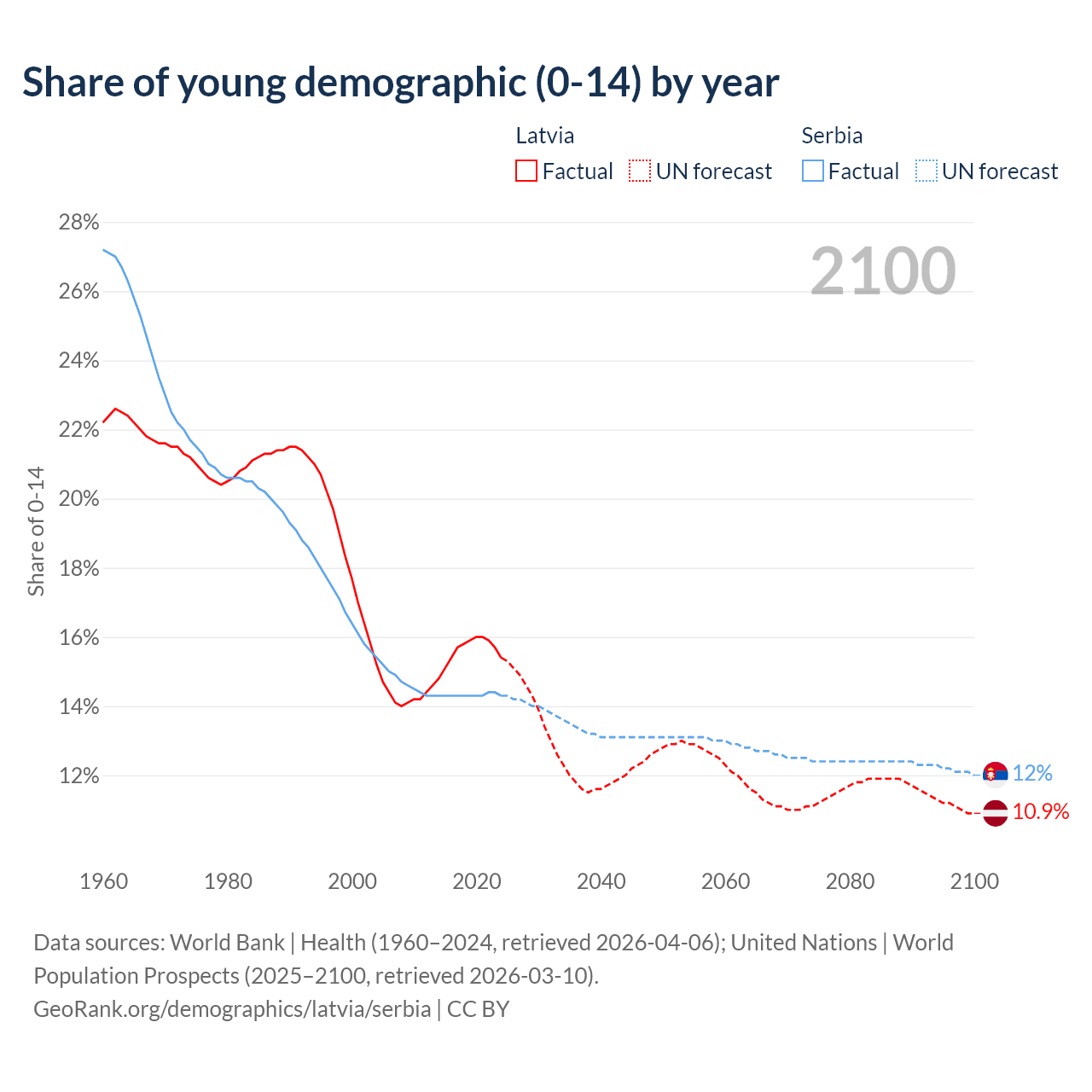 - The share of young demographic (0-15 years old) in Latvia is 15.4% vs 14.3% in Serbia.