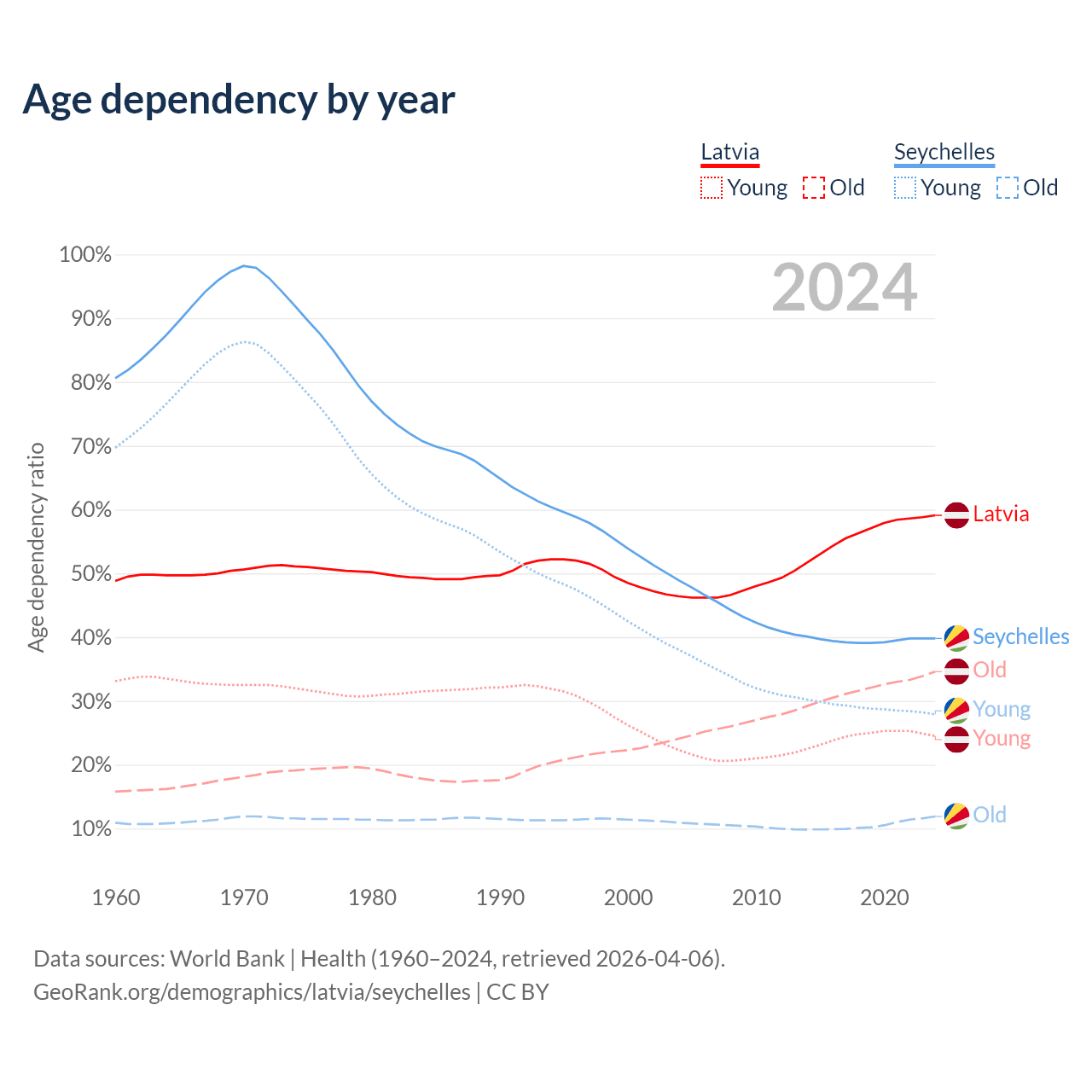 - Latvia is ranked 20/196 by median age (oldest to youngest) vs 76/196 for the Seychelles.