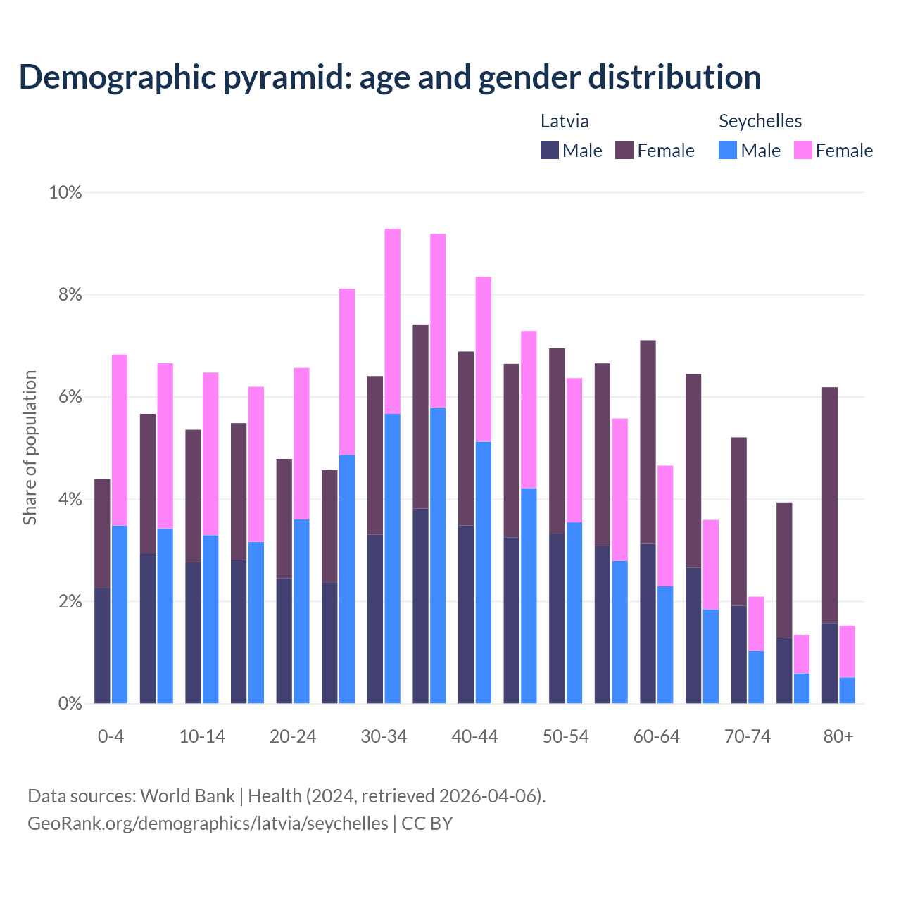 - As of 2026, the population of Latvia is 1.83M vs 126K in the Seychelles - 14.5 times difference.