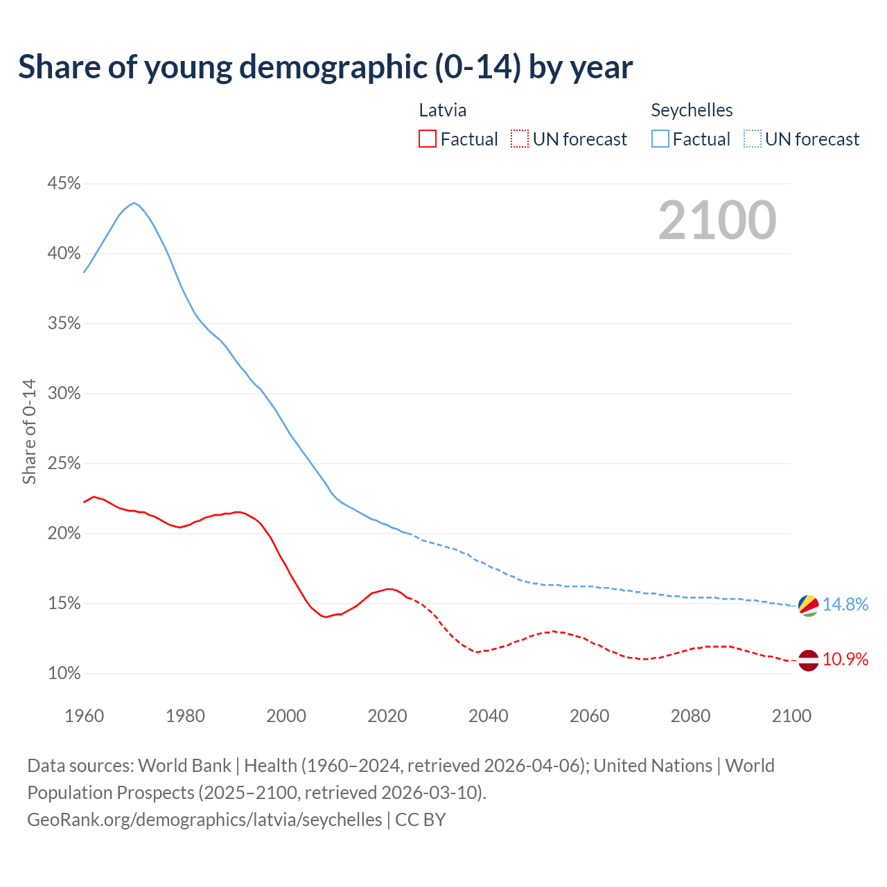 - The share of young demographic (0-15 years old) in Latvia is 15.4% vs 20% in the Seychelles.
