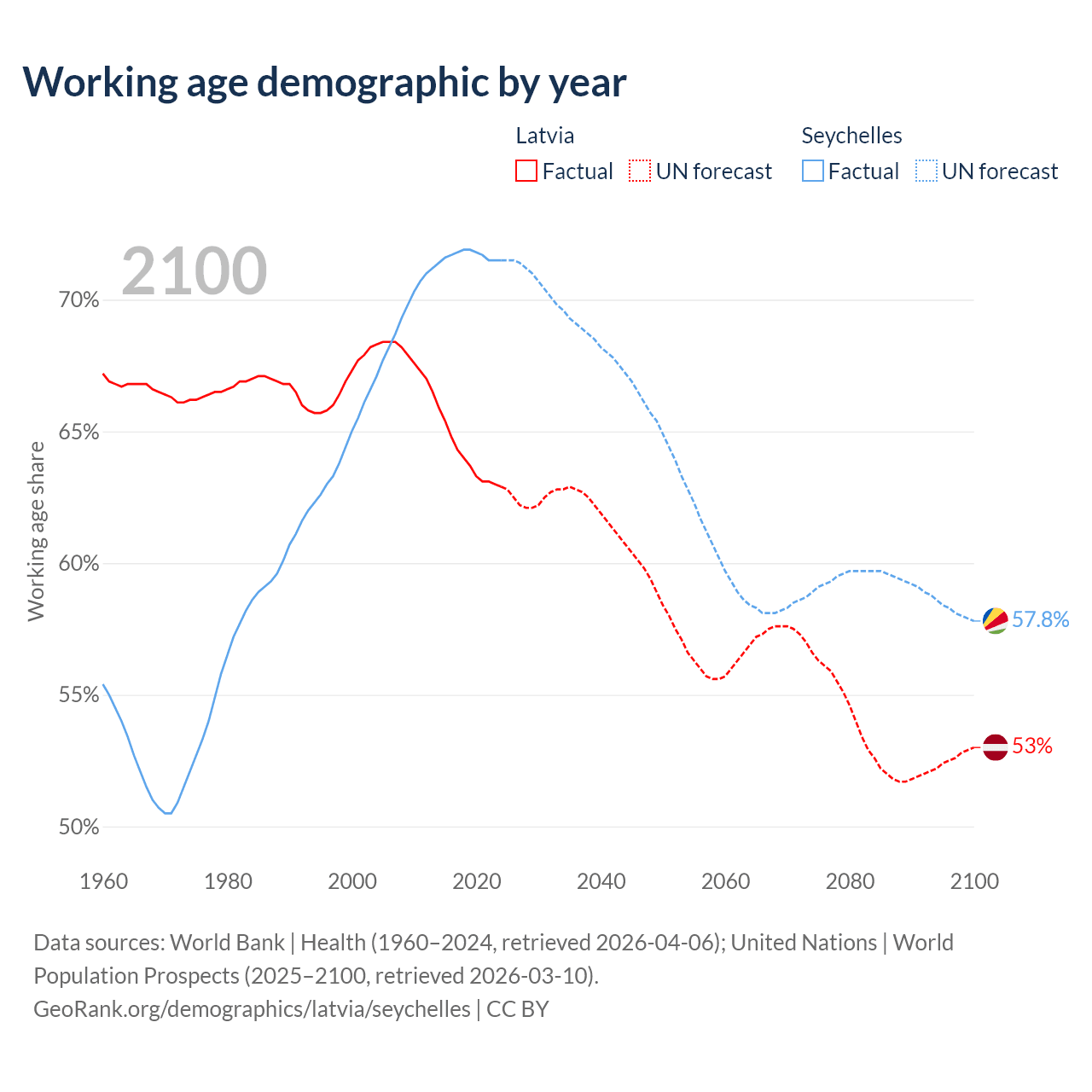 - Latvia has 1.15M working age adults (aged 15-64) vs 90.3K in the Seychelles.
