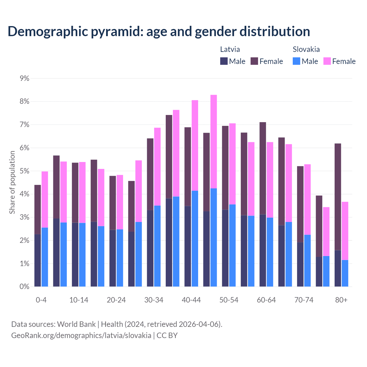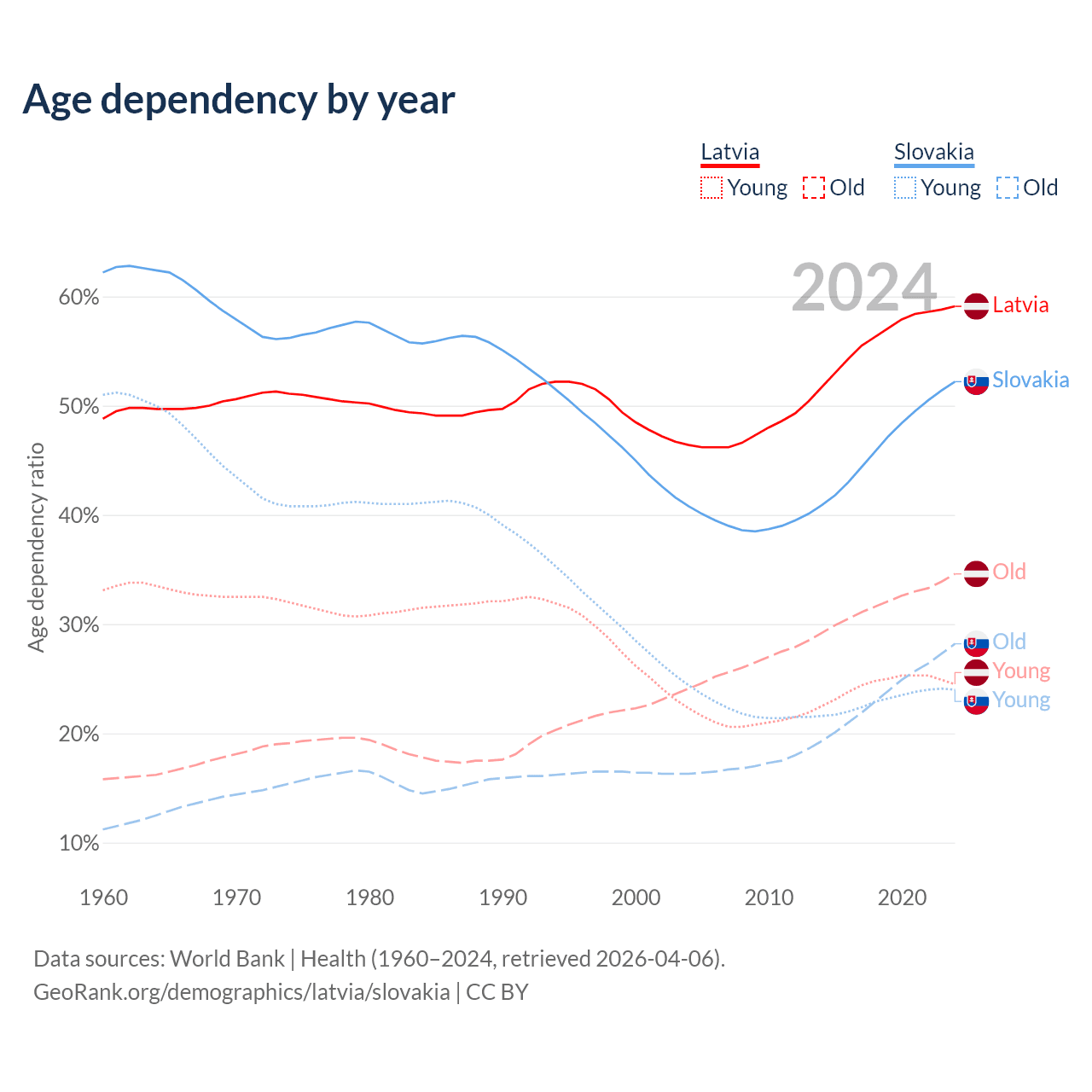 - Latvia is ranked 20/196 by median age (oldest to youngest) vs 31/196 for Slovakia.