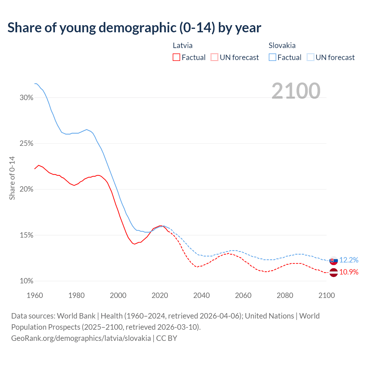 - The share of young demographic (0-15 years old) in Latvia is 15.4% vs 15.8% in Slovakia.