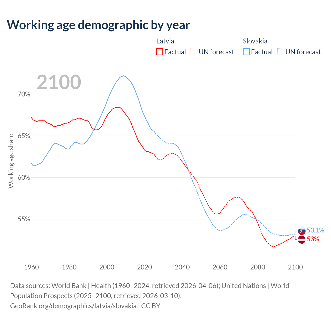 Median age Latvia vs Slovakia, 1960-2100