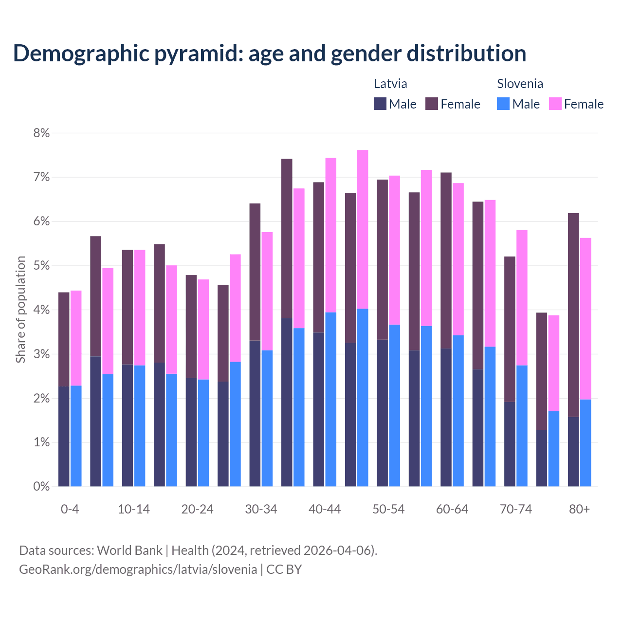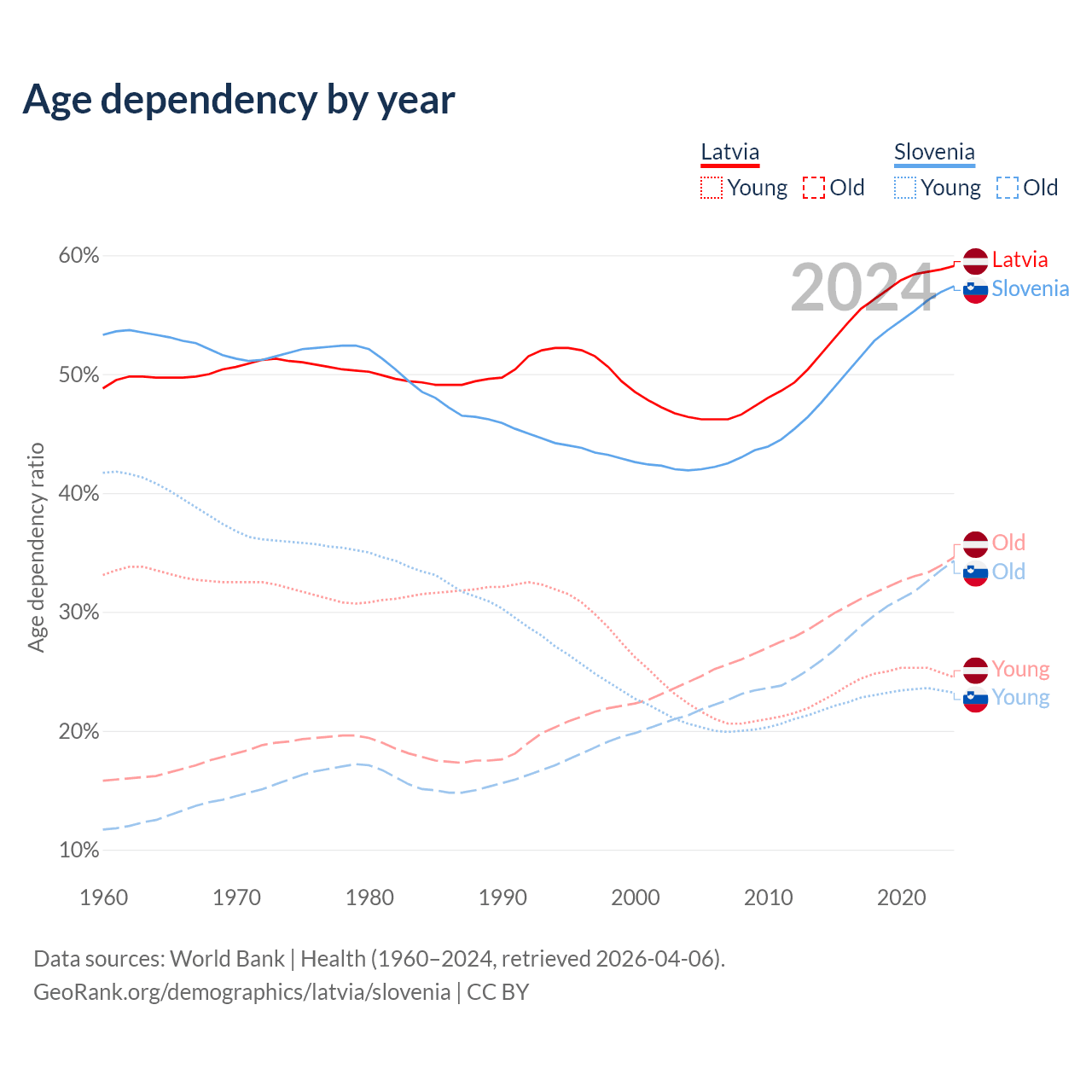 - Latvia is ranked 20/196 by median age (oldest to youngest) vs 14/196 for Slovenia.