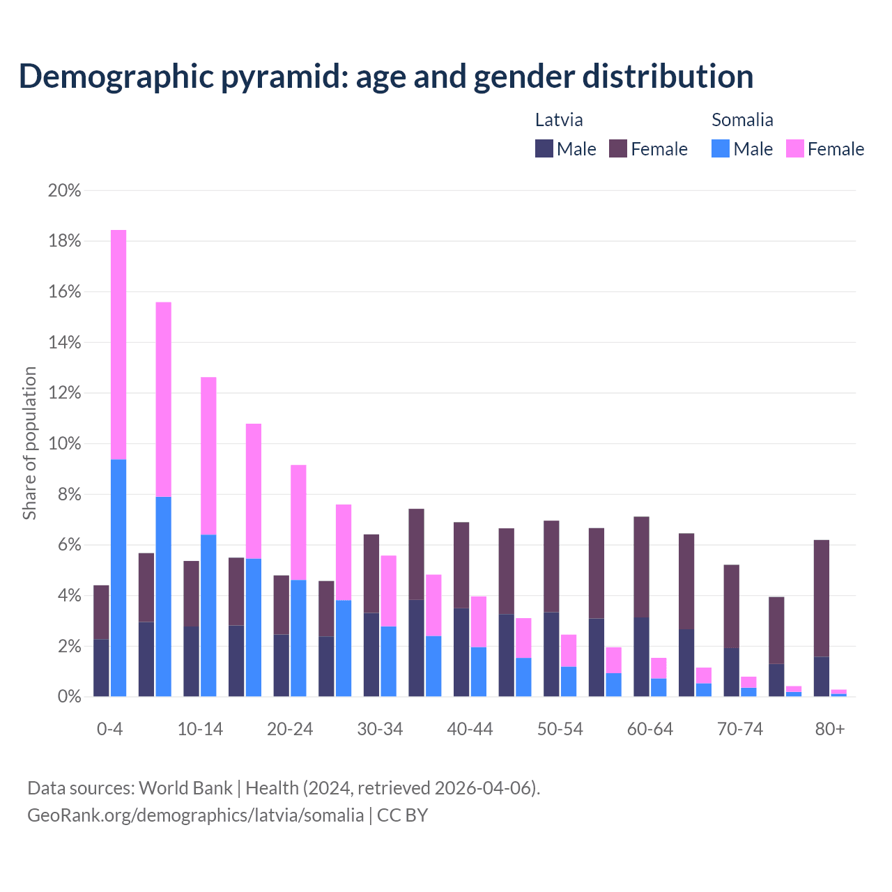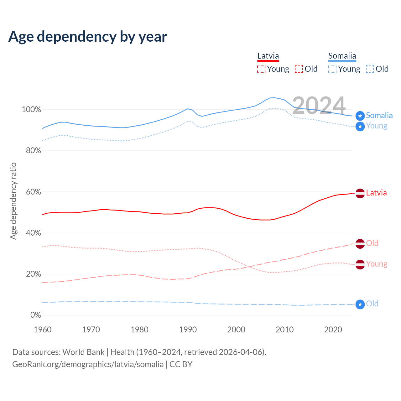 - Latvia is ranked 20/196 by median age (oldest to youngest) vs 194/196 for Somalia.