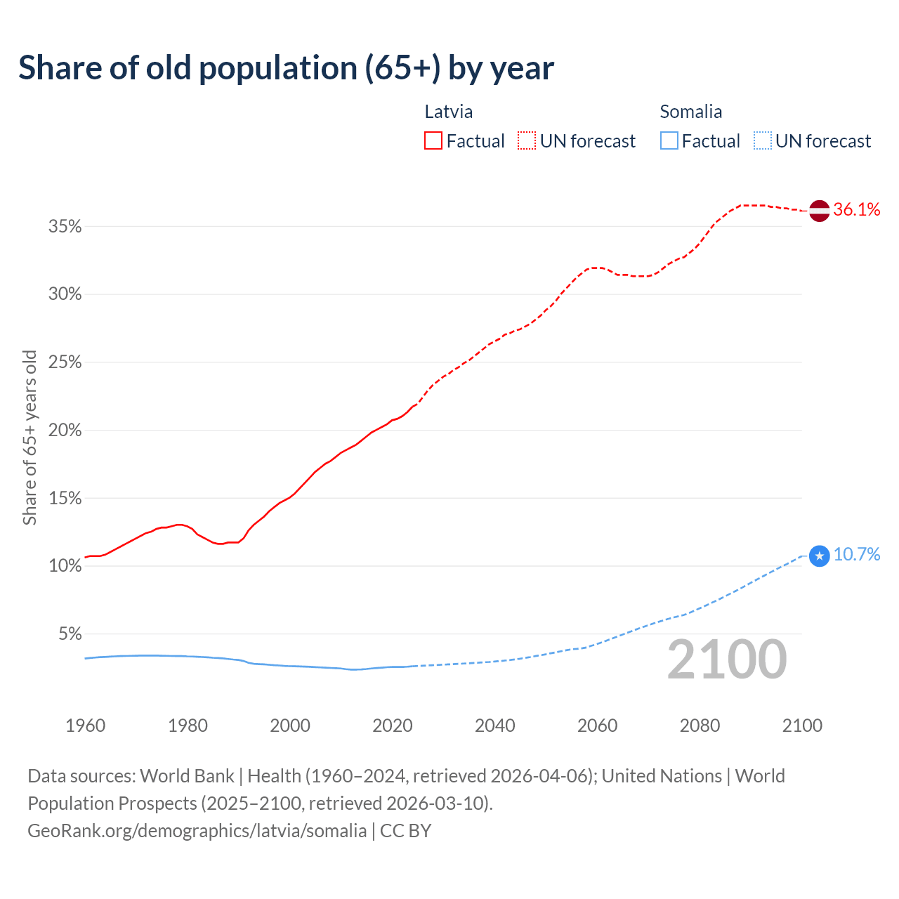 - The share of old-age demographic (65+) in Latvia is 21.7% vs 2.59% in Somalia.