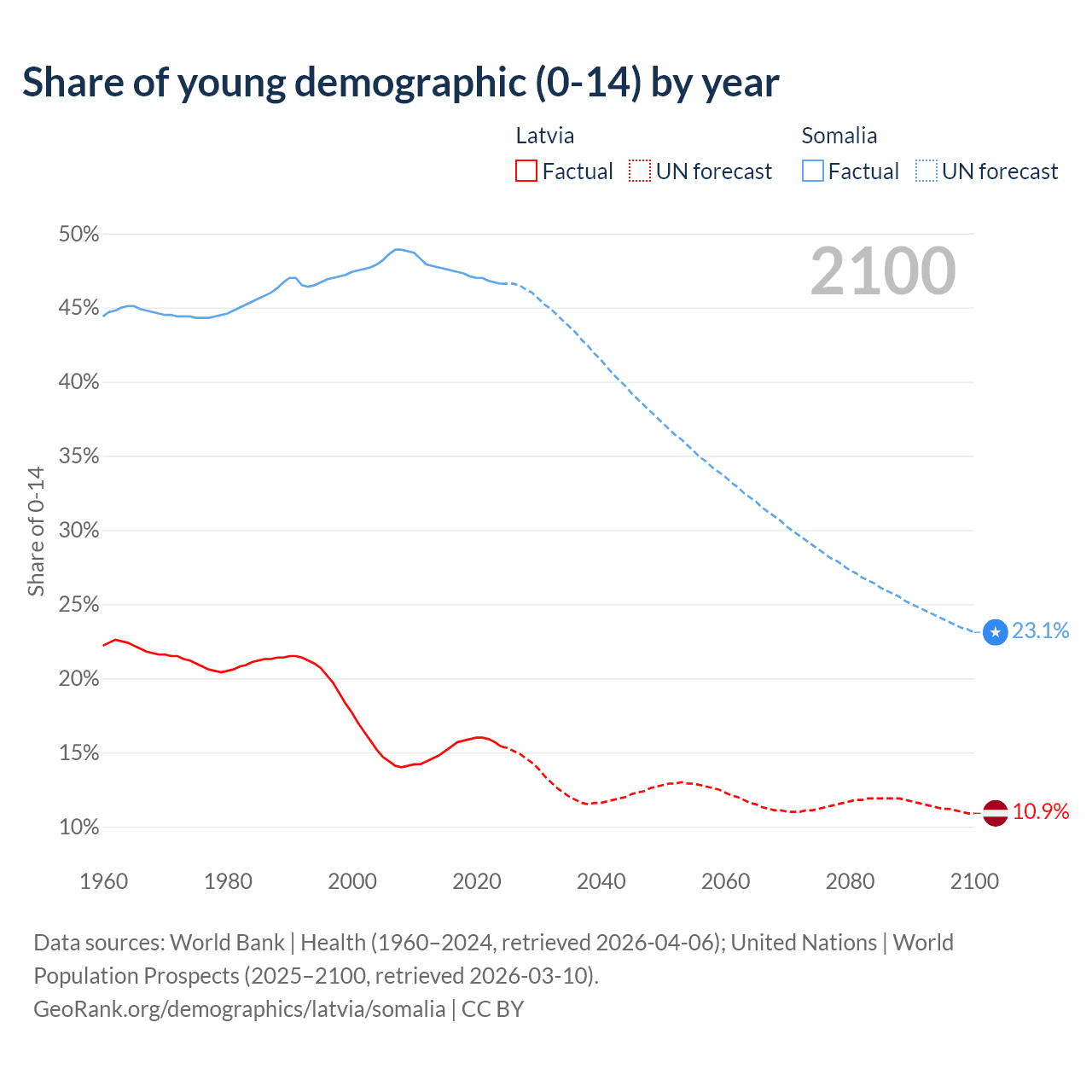 - The share of young demographic (0-15 years old) in Latvia is 15.4% vs 46.6% in Somalia.