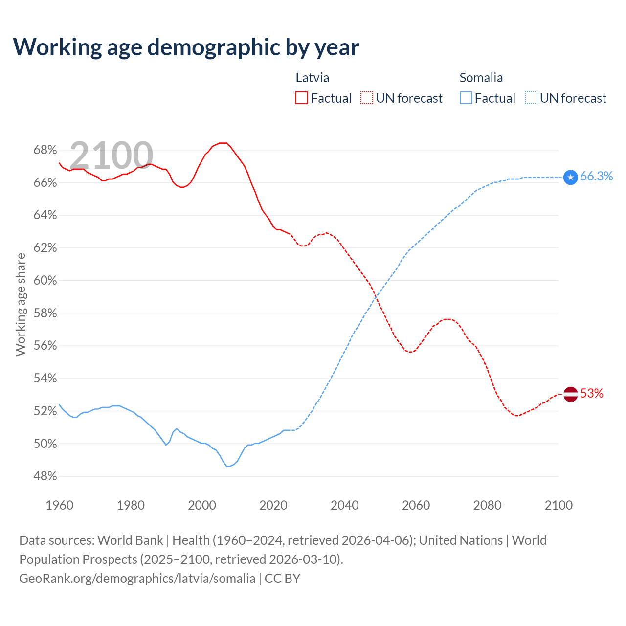 - Latvia has 1.15M working age adults (aged 15-64) vs 10.4M in Somalia.
