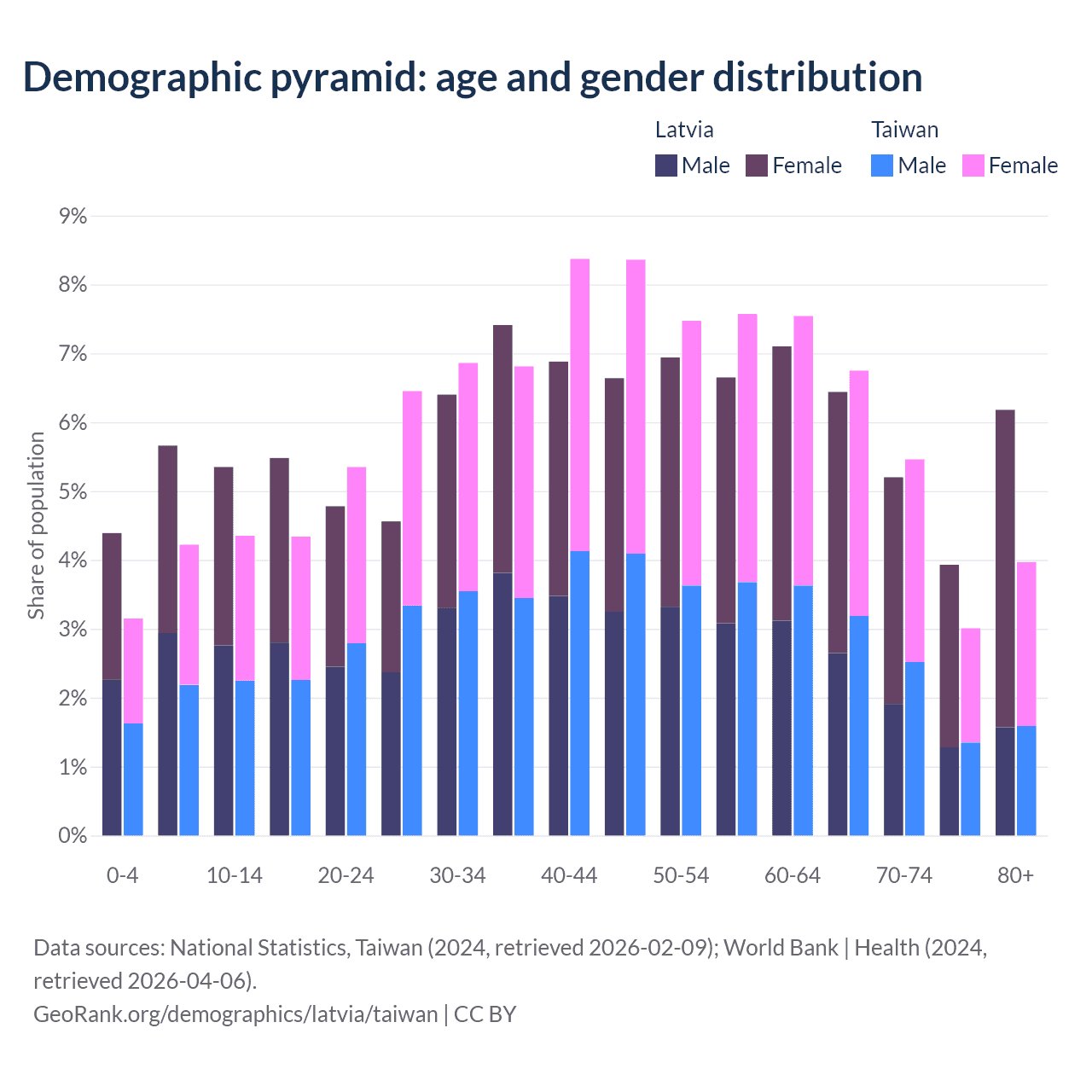 - Latvia is ranked 20/196 by median age (oldest to youngest) vs 16/196 for Taiwan.