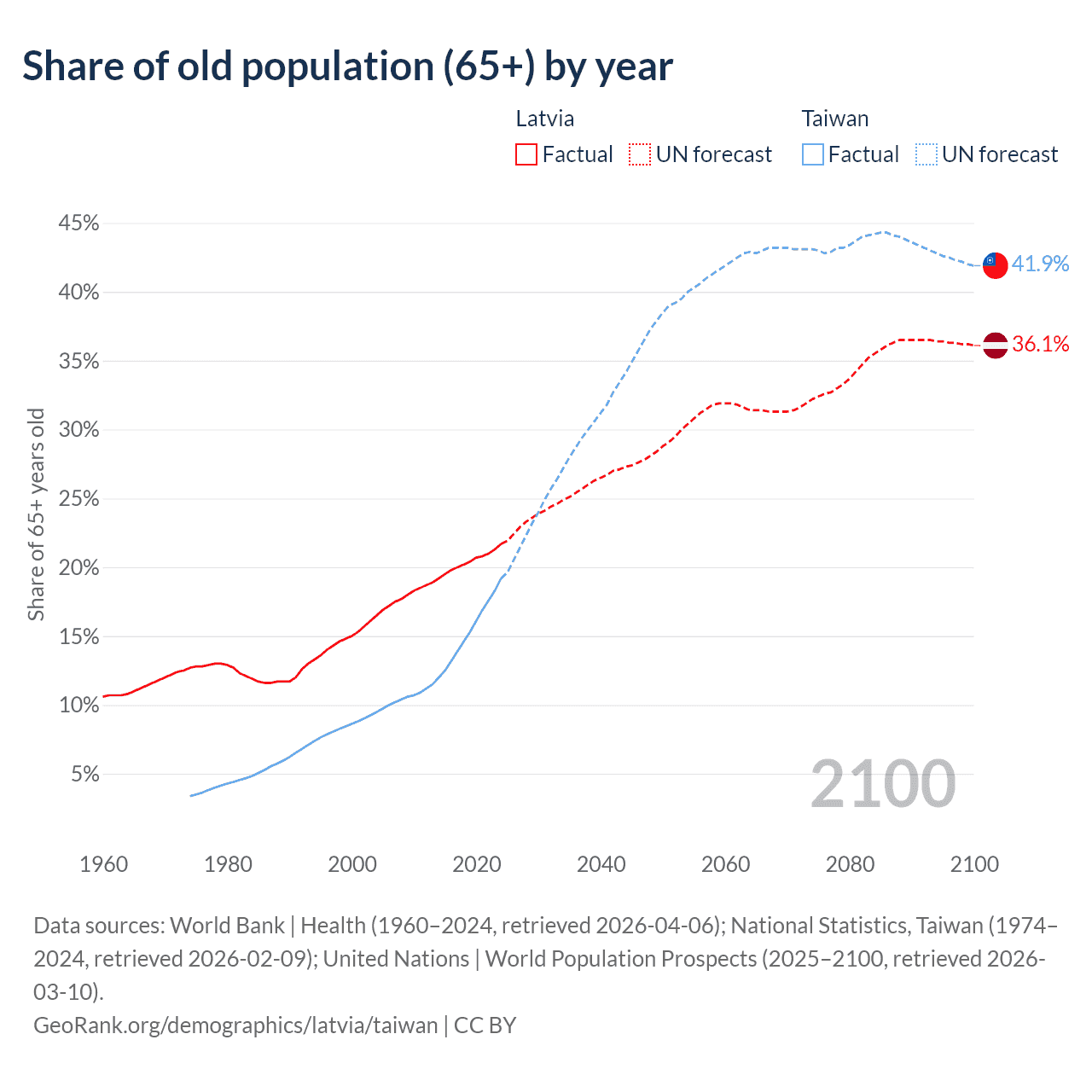 The share of older people aged 65 and over is 21.7% in Latvia and 19.2% in Taiwan. Life expectancy in Latvia compared to Taiwan .
