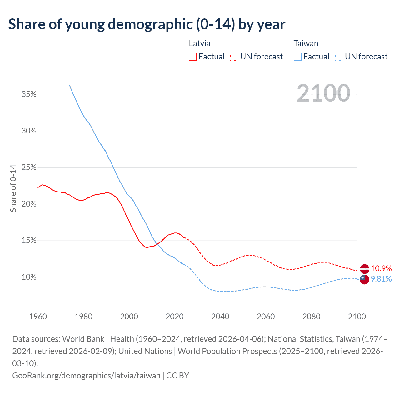 - The share of young demographic (0-15 years old) in Latvia is 15.4% vs 11.7% in Taiwan.