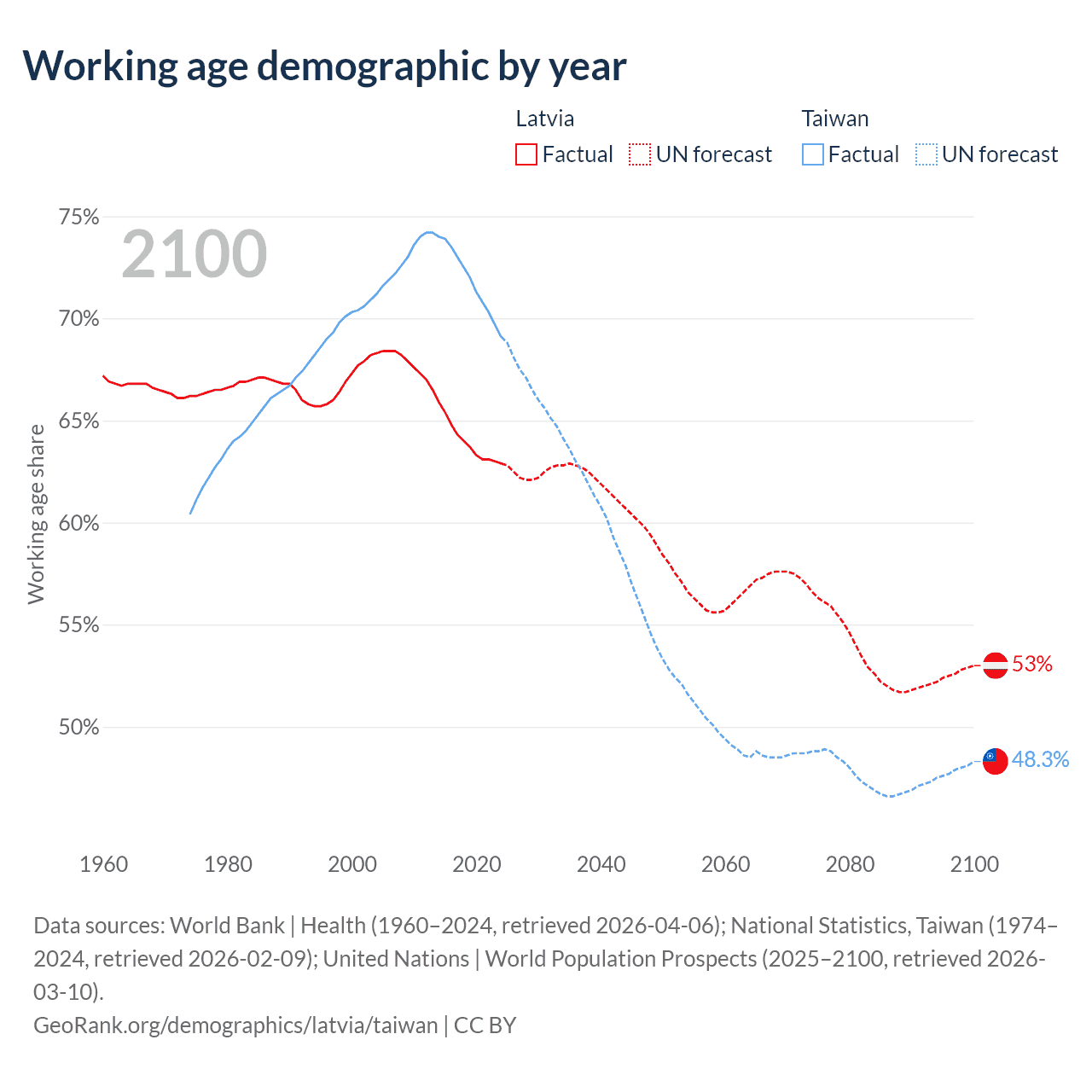 - Latvia has 1.15M working age adults (aged 15-64) vs 16.1M in Taiwan.
