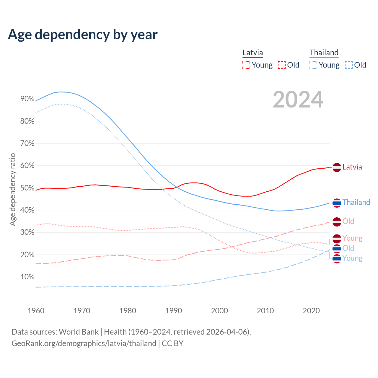 - Latvia is ranked 20/196 by median age (oldest to youngest) vs 40/196 for Thailand.