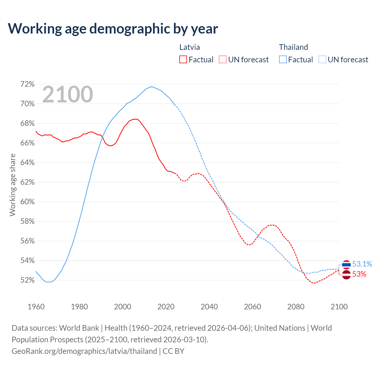 Median age Latvia vs Thailand, 1960-2100