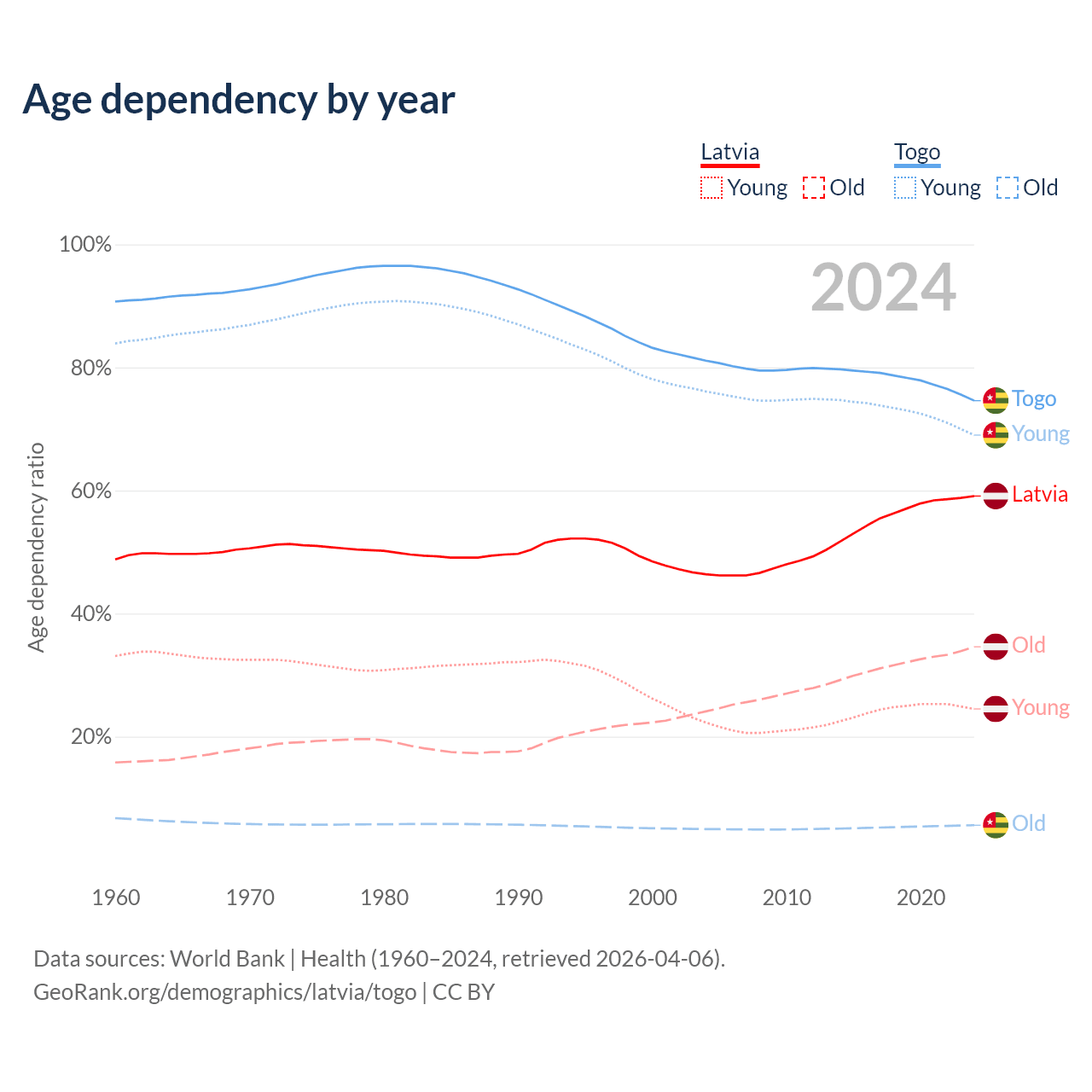 - Latvia is ranked 20/196 by median age (oldest to youngest) vs 166/196 for Togo.