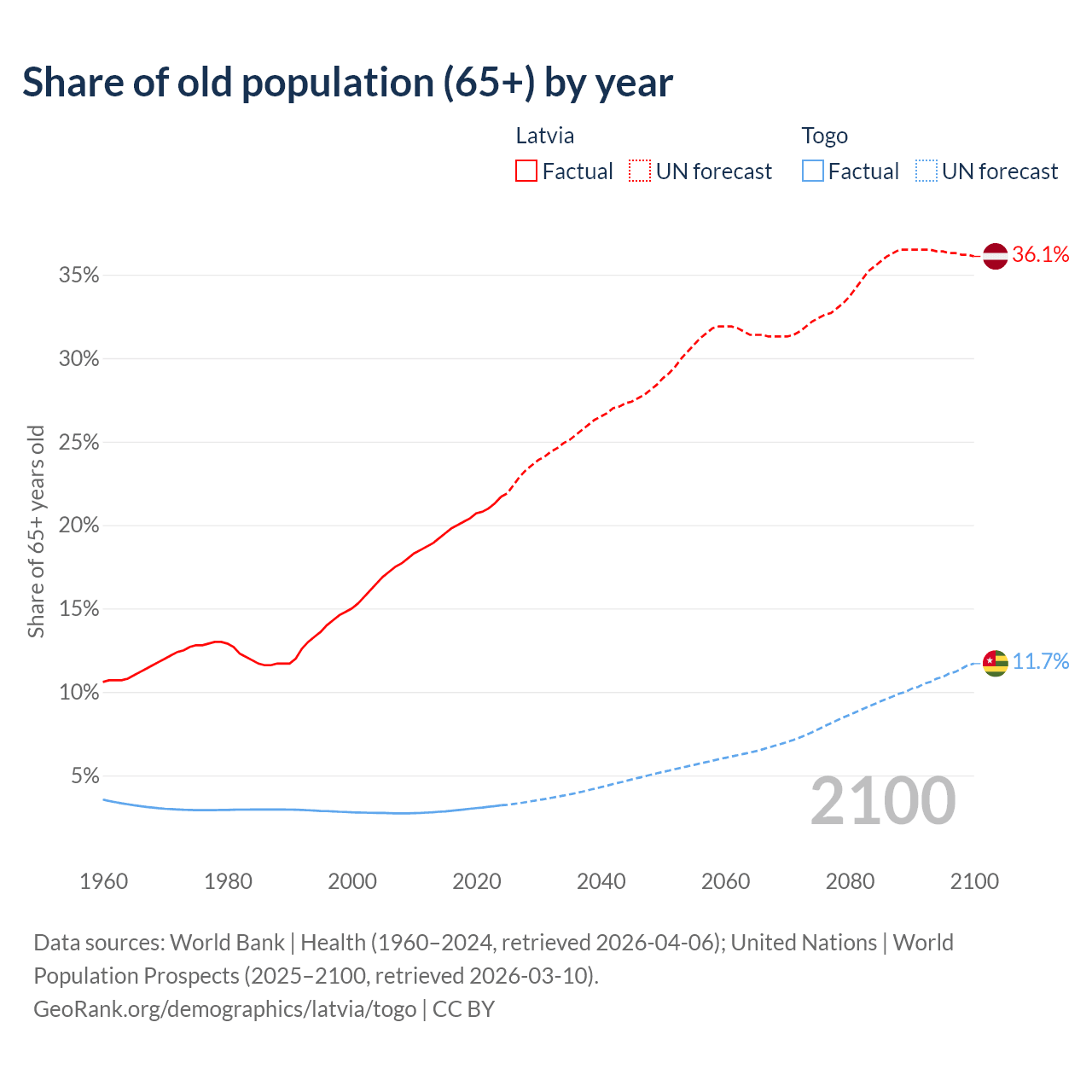 The share of older people aged 65 and over is 21.7% in Latvia and 3.21% in Togo. Life expectancy in Latvia compared to Togo .