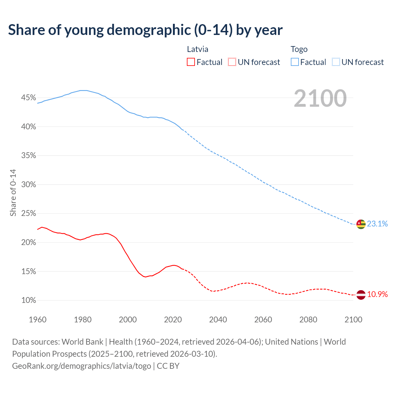 - The share of young demographic (0-15 years old) in Latvia is 15.4% vs 39.5% in Togo.