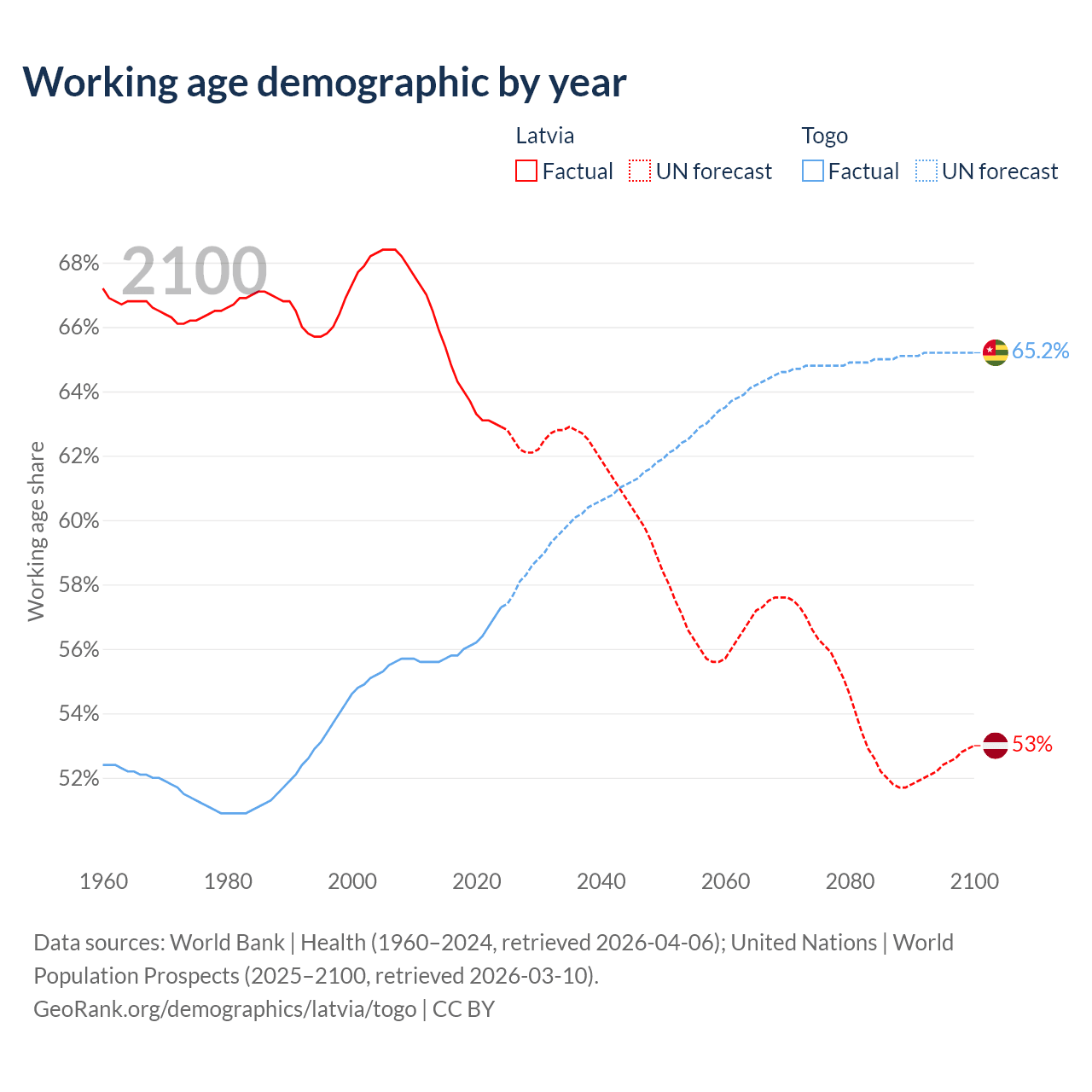 - Latvia has 1.15M working age adults (aged 15-64) vs 5.72M in Togo.
