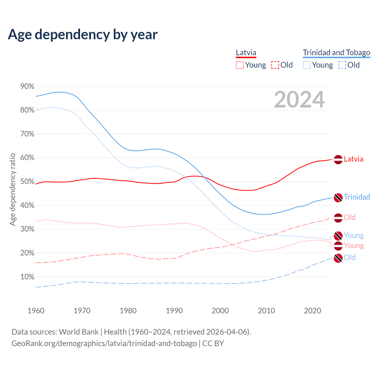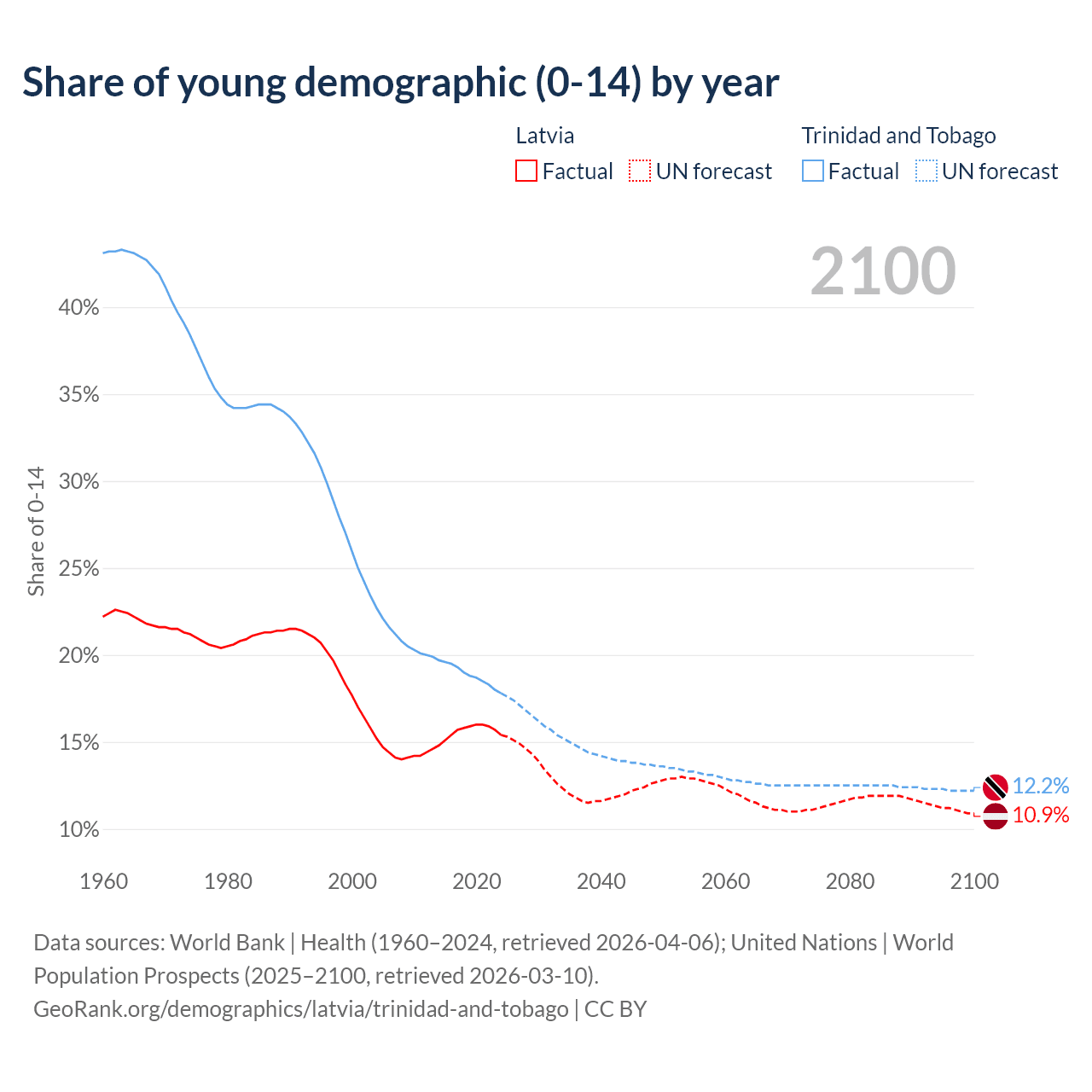 - The share of young demographic (0-15 years old) in Latvia is 15.4% vs 17.8% in Trinidad and Tobago.