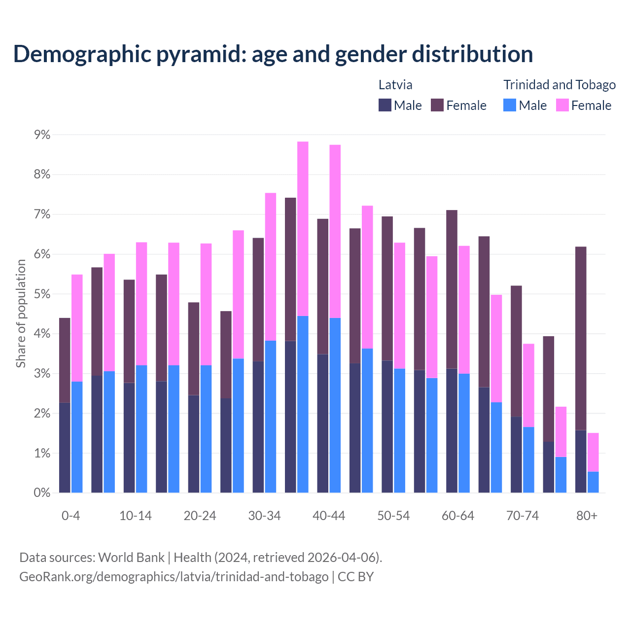- Latvia is ranked 20/196 by median age (oldest to youngest) vs 58/196 for Trinidad and Tobago.