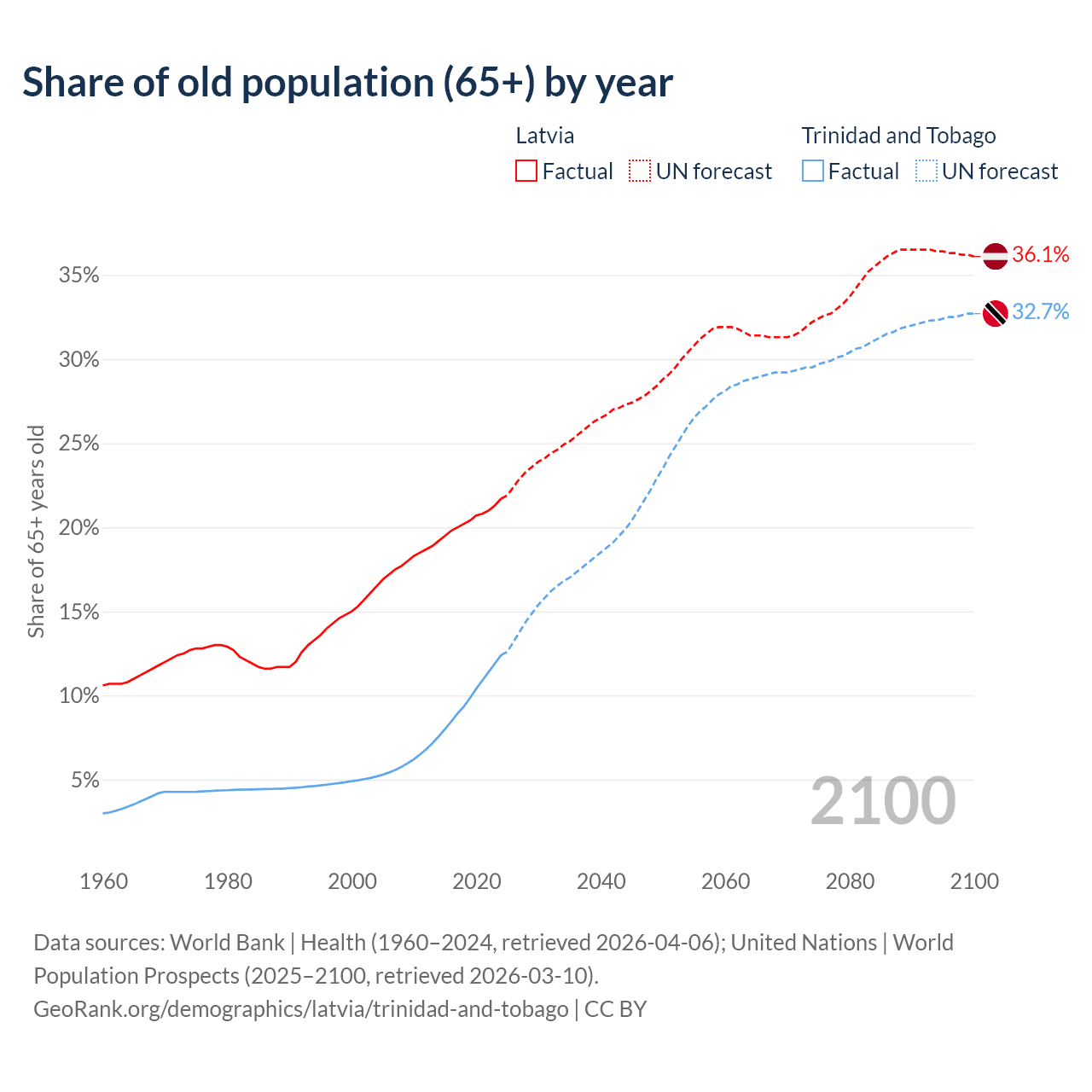 The share of older people aged 65 and over is 21.7% in Latvia and 12.4% in Trinidad and Tobago. Life expectancy in Latvia compared to Trinidad and Tobago .