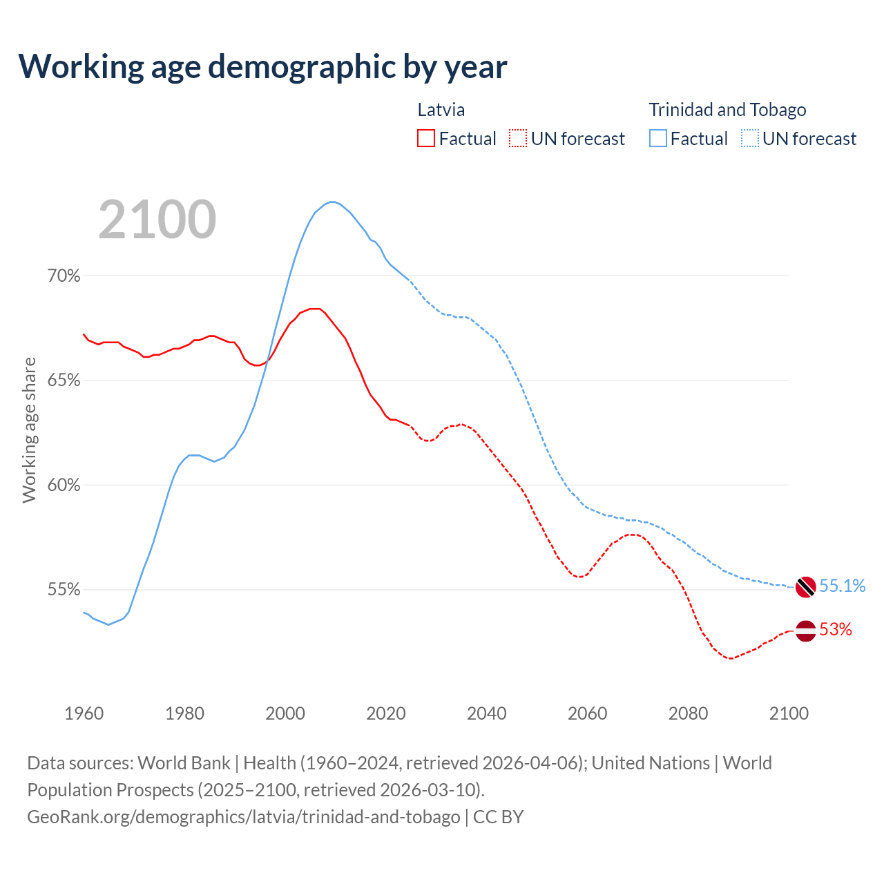 - Latvia has 1.15M working age adults (aged 15-64) vs 960K in Trinidad and Tobago.