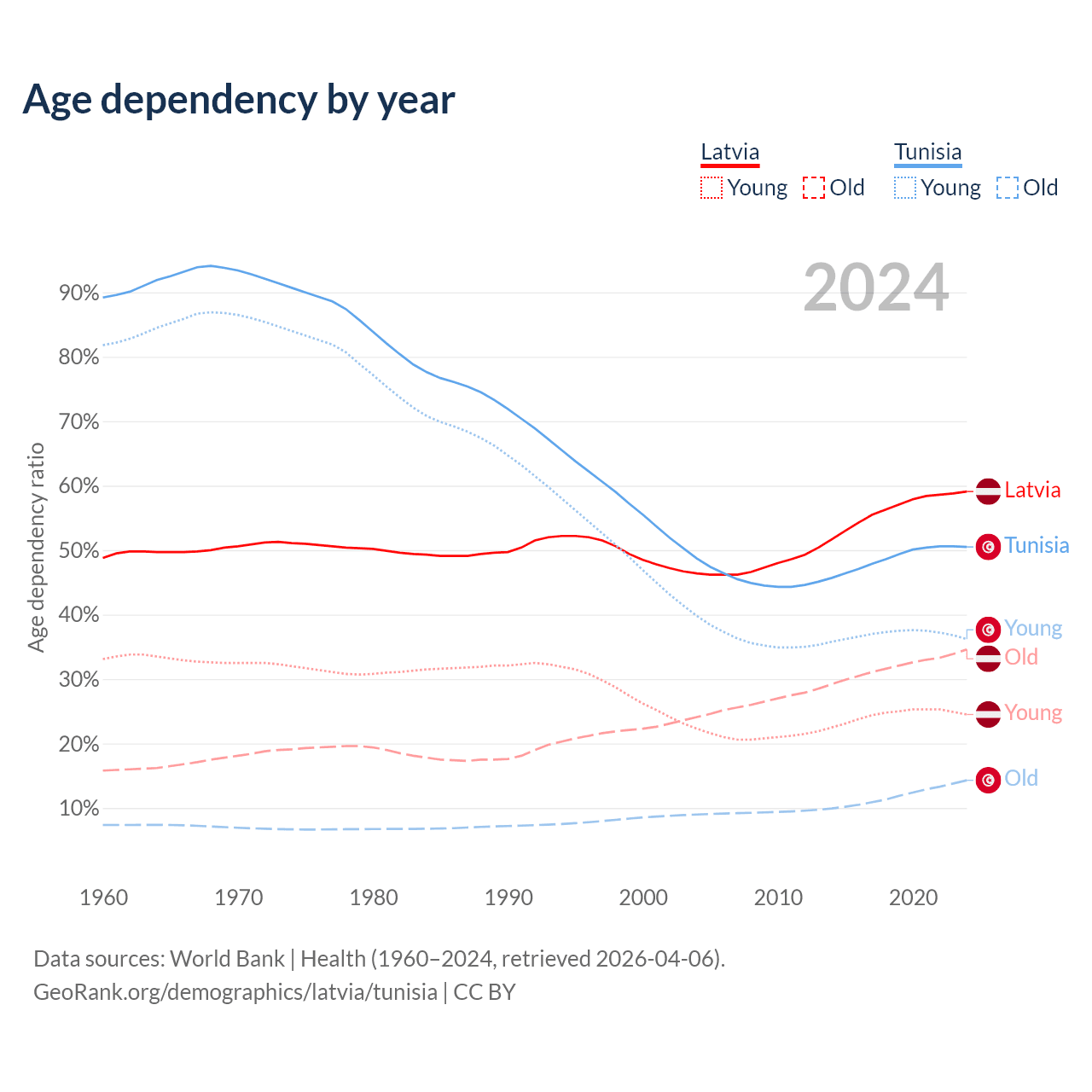 - Latvia is ranked 20/196 by median age (oldest to youngest) vs 86/196 for Tunisia.