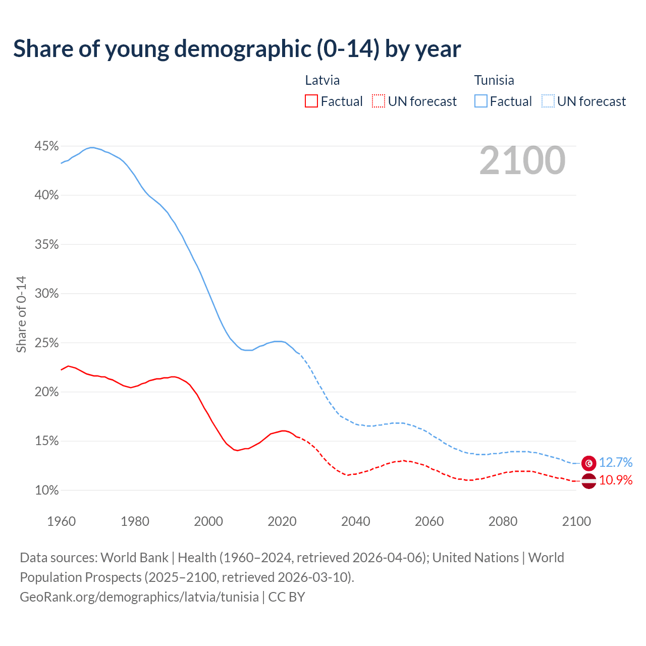 - The share of young demographic (0-15 years old) in Latvia is 15.4% vs 24% in Tunisia.