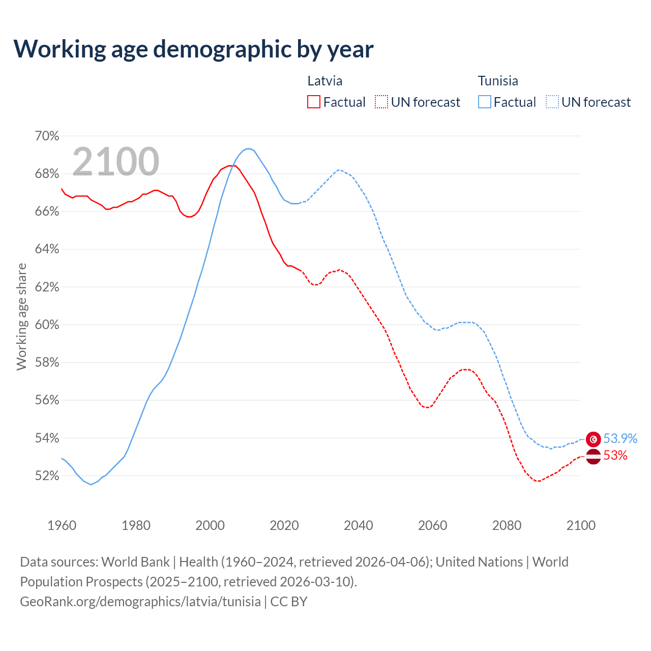 - Latvia has 1.15M working age adults (aged 15-64) vs 8.26M in Tunisia.
