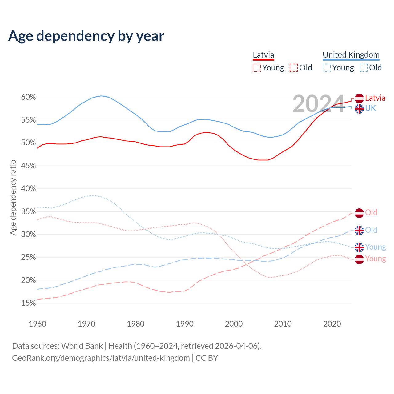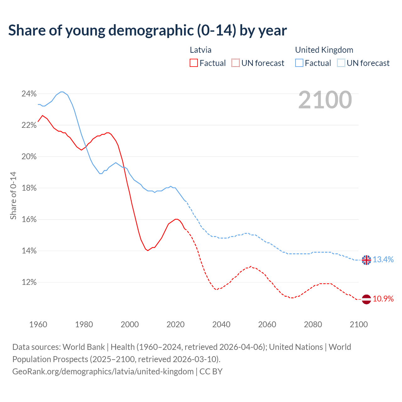 - The share of young demographic (0-15 years old) in Latvia is 15.4% vs 17.2% in the United Kingdom.