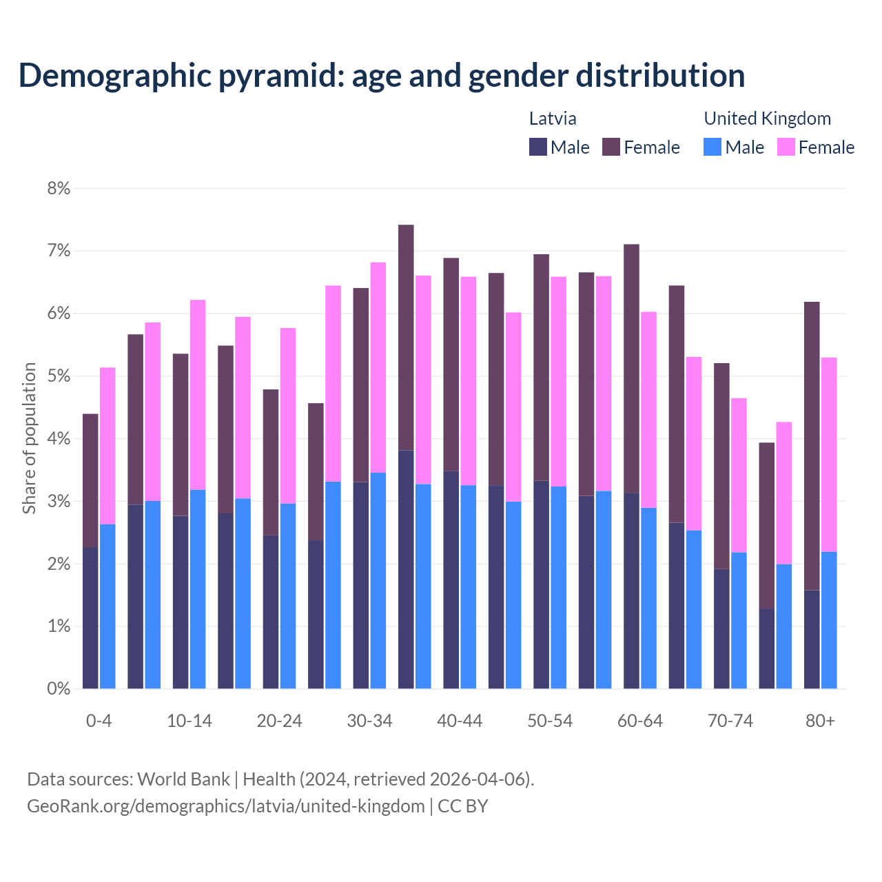 - Latvia is ranked 20/196 by median age (oldest to youngest) vs 41/196 for the United Kingdom.