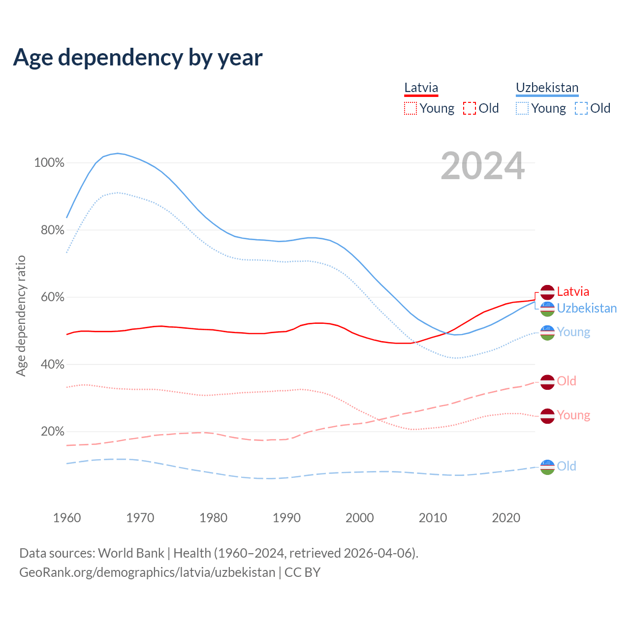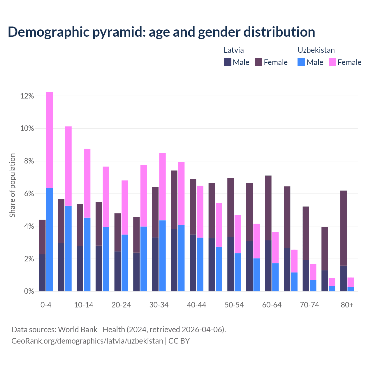 - Latvia is ranked 20/196 by median age (oldest to youngest) vs 116/196 for Uzbekistan.
